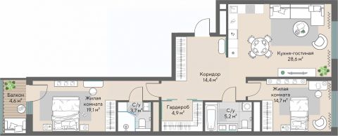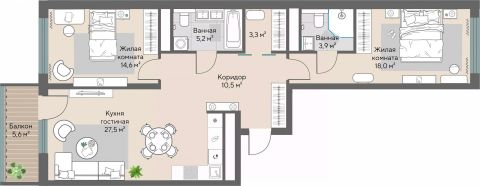 Квартира для счастливой семьиКонцепция ''тихий дом'': все квартиры в доме с чистовой отделкой, никаких шумных ремонтных работ с утра до вечераКухня-гостиная 19,6 м² объединяет в себе удобство и эстетику. Здесь легко готовить, собираться за общим столом и проводить вечера в тёплой обстановке. Большая площадь даёт возможность зонировать пространство и создать уютный уголок для отдыхаДва санузла избавят от утренней спешки. Ванная комната 4,1 м² станет личной зоной релакса, а дополнительный санузел 1,7 м² добавит удобства в повседневной жизниПрихожая 5,2 м² продумана до мелочей. Место для хранения организовано так, чтобы вещи не загромождали пространство, а порядок поддерживался легко и естественноСпальня 10,0 м² наполнена естественным светом и уединённостью. Выход на лоджию 3,3 м² создаёт дополнительное пространство для отдыха и позволяет наслаждаться тишиной двораДетская 10,8 м² — уютная и многофункциональная. Достаточно места и для игр, и для спокойного обучения, а окно делает комнату светлой и комфортной