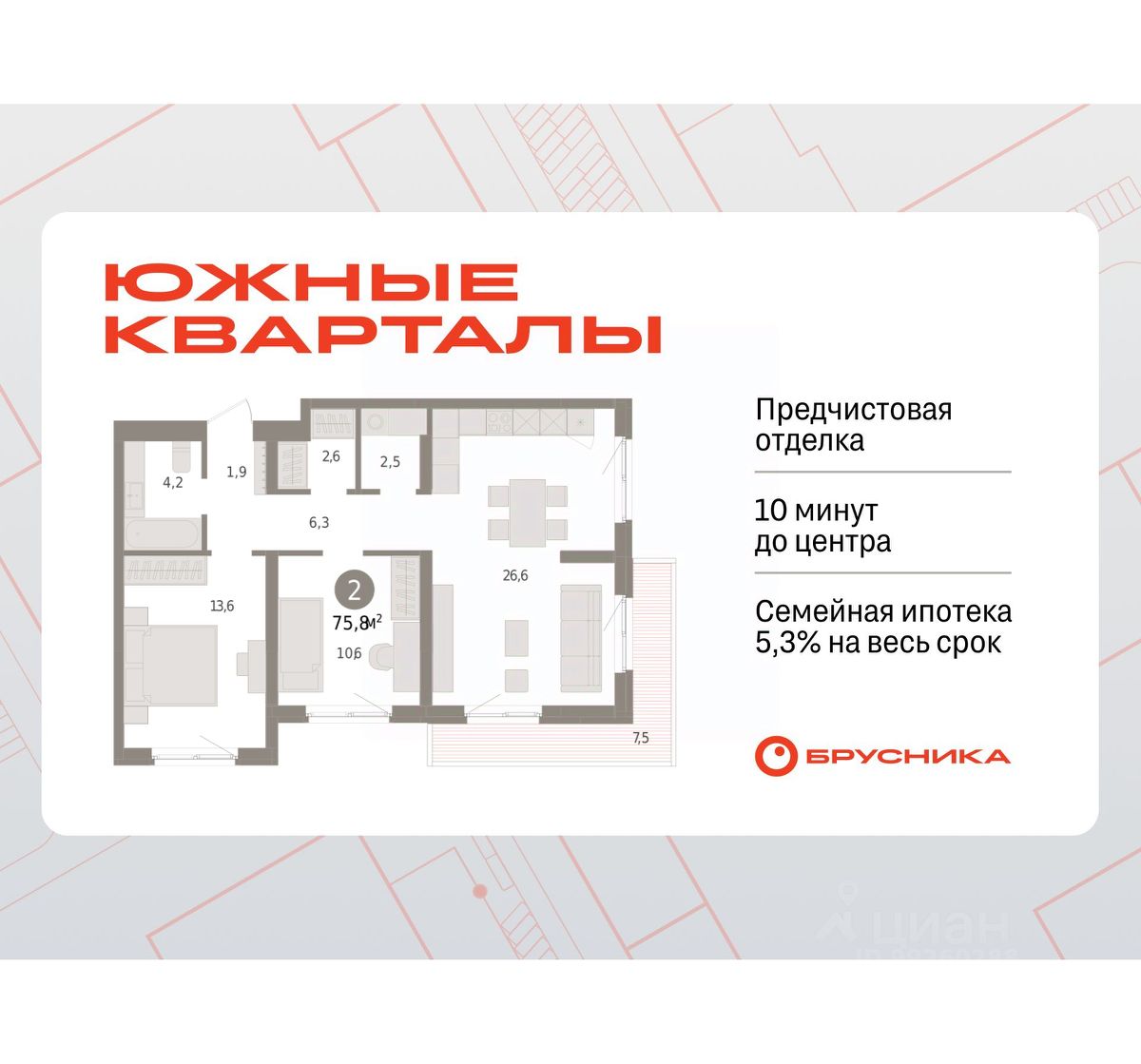 Спешите забронировать, пока действует скидка! Предложение ограничено! Стоимость квартиры указана со скидкой, ваша экономия составит 360,000 RUB. Звоните, мы вам все подробно расскажем! Двухкомнатная квартира от застройщика с предчистовой отделкой в ЖК ''Квартал Траектория'' на 4 этаже. Общая площадь: 63.4 кв.м., жилая: 26.6 кв.м., площадь просторной кухни-столовой: 18.9 кв.м. Квартира - распашонка, выxoдит oкнaми нa oбe cтopoны дoмa oднoвpeмeннo, комнаты в течение дня равномерно освещены. В квартире один балкон, два совмещенных санузла. Высота потолков 2.82 м. Дом монолитный, многоподъездный, переменной этажности, от 7 до 25 этажей. Квартира находится в 6-й секции высотой 7 этажей в корпусе 1-1. На этаже 4 квартиры. В подъезде 1 грузовой лифт. Начало строительства - 4 квартал 2025 года. Окончание строительства - 4 квартал 2027 года. Оформление сделки по договору долевого участия. Квартира с кухней-гостиной и двумя спальнями в квартале ''Траектория''. Особенности планировки: окна на две стороны, вид во двор, разнесённые спальни, предчистовая отделка, мастер-спальня, балкон. квартиры в нашей базе: МНВ01-Ж6.4.4. Квартал ''Траектория'' строится в границах улиц Билимбаевской, Расточной, Монтажников и Маневровой Раньше здесь находился оборонный завод 5-ЦАРЗ, основанный в 1945 году. После войны он ремонтировал военную и грузовую технику — от ''Виллисов'' и ''Студебекеров'' до советских ЗИС-5 и ГАЗ-67. Сортировка — район с развитой инфраструктурой, обжитыми жилыми кварталами разных эпох и большим количеством парков. До центра Екатеринбурга — 20 минут на машине. Туда же можно отправиться на автобусе: ближайшая остановка общественного транспорта — в 4 минутах от ''Траектории''. Рядом с ''Траекторией'' расположены магазины, торговый центр, детские сады, школы, поликлиники и полезные сервисы, а также другой проект Брусники — квартал ''Депо''. Если хочется развлечений, можно отправиться в ТРЦ ''Карнавал'' и парк с аттракционами ''Таганская слобода'' — дорога туда займёт не более 10 минут на машине. Квартал ''Траектория'' — первый этап комплексного развития территории, которую раньше занимали производственные здания. На месте бывших цехов Брусника создаст дружелюбную среду и комфортное пешеходное пространство для всего района. Для озеленения квартала мы подобрали больше 60 видов растений: ольху, липу, клён, иву, грушу, вишню, сирень, барбарис, гортензию, смородину, ирис, декоративные травы. Они цветут в разное время года и постоянно меняют настроение двора. В ''Траектории'' мы предусмотрели несколько общественных пространств, открытых для всех горожан: встречающий сквер, лесопарк у храма и событийный сквер между домами. Когда захочется тишины и уединения, можно устроить прогулку во внутренних дворах: в них нет машин и посторонних, зато много зелени, света и мест для отдыха. Каждый двор в квартале ''Траектория'' — продолжение квартиры, только под открытым небом. Здесь можно прогуляться босиком по траве, устроить утреннюю йогу, почитать книгу в гамаке или отправ