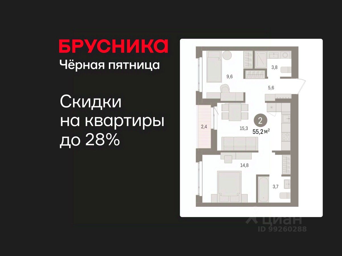 Успейте забронировать по этой цене! Предложение ограничено! Стоимость квартиры указана со скидкой, ваша экономия составит 360,000 RUB. Звоните, наши менеджеры вам все расскажут! Просторная двухкомнатная квартира с предчистовой отделкой в ЖК ''Квартал Траектория'' на 4 этаже. Общая площадь: 55.2 кв.м., жилая: 24.4 кв.м., площадь просторной кухни-столовой: 15.3 кв.м. Комнаты изолированные, все окна выходят на одну сторону. В квартире одна лоджия, два совмещенных санузла. Высота потолков 2.82 м. Дом монолитный, многоподъездный, переменной этажности, от 7 до 16 этажей. Квартира находится во 2-й секции высотой 7 этажей в корпусе 1-2. На этаже 8 квартир. В подъезде 1 грузовой лифт. Начало строительства - 4 квартал 2025 года. Окончание строительства - 4 квартал 2027 года. Оформление сделки по договору долевого участия. Квартира с кухней-гостиной и двумя спальнями в квартале ''Траектория''. Особенности планировки: гардеробная, лоджия, разнесённые спальни, предчистовая отделка, мастер-спальня. квартиры в нашей базе: МНВ01-Ж10.4.3. Квартал ''Траектория'' строится в границах улиц Билимбаевской, Расточной, Монтажников и Маневровой Раньше здесь находился оборонный завод 5-ЦАРЗ, основанный в 1945 году. После войны он ремонтировал военную и грузовую технику — от ''Виллисов'' и ''Студебекеров'' до советских ЗИС-5 и ГАЗ-67. Сортировка — район с развитой инфраструктурой, обжитыми жилыми кварталами разных эпох и большим количеством парков. До центра Екатеринбурга — 20 минут на машине. Туда же можно отправиться на автобусе: ближайшая остановка общественного транспорта — в 4 минутах от ''Траектории''. Рядом с ''Траекторией'' расположены магазины, торговый центр, детские сады, школы, поликлиники и полезные сервисы, а также другой проект Брусники — квартал ''Депо''. Если хочется развлечений, можно отправиться в ТРЦ ''Карнавал'' и парк с аттракционами ''Таганская слобода'' — дорога туда займёт не более 10 минут на машине. Квартал ''Траектория'' — первый этап комплексного развития территории, которую раньше занимали производственные здания. На месте бывших цехов Брусника создаст дружелюбную среду и комфортное пешеходное пространство для всего района. Для озеленения квартала мы подобрали больше 60 видов растений: ольху, липу, клён, иву, грушу, вишню, сирень, барбарис, гортензию, смородину, ирис, декоративные травы. Они цветут в разное время года и постоянно меняют настроение двора. В ''Траектории'' мы предусмотрели несколько общественных пространств, открытых для всех горожан: встречающий сквер, лесопарк у храма и событийный сквер между домами. Когда захочется тишины и уединения, можно устроить прогулку во внутренних дворах: в них нет машин и посторонних, зато много зелени, света и мест для отдыха. Каждый двор в квартале ''Траектория'' — продолжение квартиры, только под открытым небом. Здесь можно прогуляться босиком по траве, устроить утреннюю йогу, почитать книгу в гамаке или отправить детей поиграть, не переживая за их безопасность. Мы закроем дворы от машин, чтобы