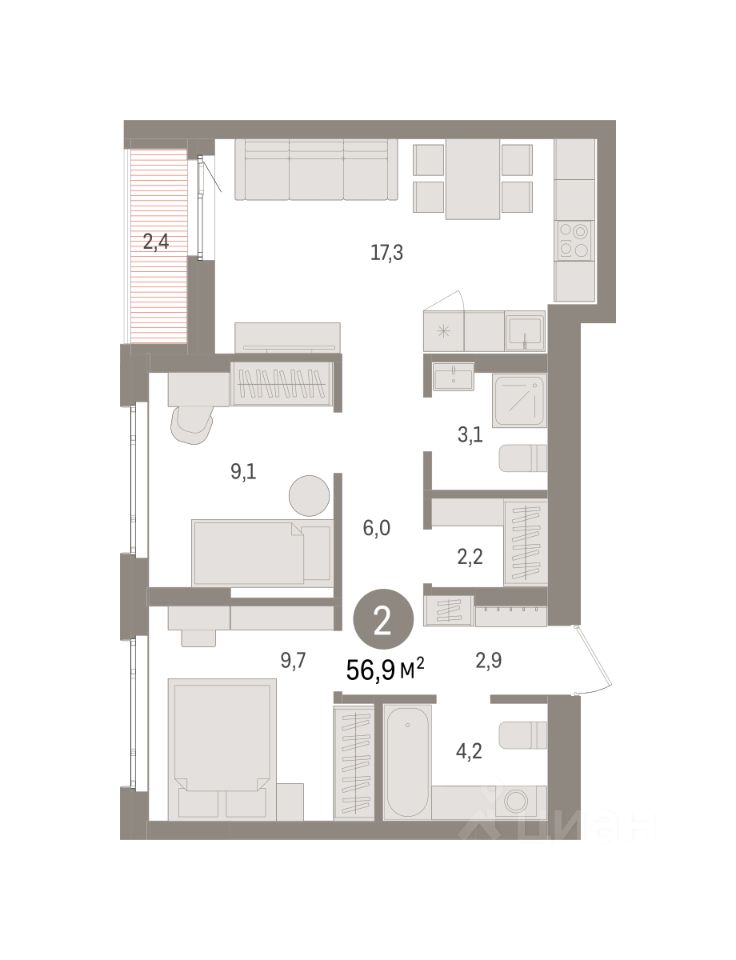 Спешите оформить бронирование, пока действует скидка! Предложение ограничено! Стоимость квартиры указана со скидкой, ваша экономия составит 360,000 RUB. Информация по телефону, наши менеджеры вам все расскажут! 2-комн. квартира от застройщика с предчистовой отделкой в ЖК ''Квартал Траектория'' на 4 этаже. Общая площадь: 56.9 кв.м., жилая: 18.8 кв.м., площадь просторной кухни-столовой: 17.3 кв.м. Комнаты изолированные, все окна выходят на одну сторону. В квартире одна лоджия, два совмещенных санузла. Высота потолков 2.82 м. Дом монолитный, многоподъездный, переменной этажности, от 7 до 16 этажей. Квартира находится во 2-й секции высотой 7 этажей в корпусе 1-2. На этаже 8 квартир. В подъезде 1 грузовой лифт. Начало строительства - 4 квартал 2025 года. Окончание строительства - 4 квартал 2027 года. Оформление сделки по договору долевого участия. Квартира с кухней-гостиной и двумя спальнями в квартале ''Траектория''. Особенности планировки: второй санузел, гардеробная, лоджия, разнесённые спальни, предчистовая отделка. квартиры в нашей базе: МНВ01-Ж10.4.6. Квартал ''Траектория'' строится в границах улиц Билимбаевской, Расточной, Монтажников и Маневровой Раньше здесь находился оборонный завод 5-ЦАРЗ, основанный в 1945 году. После войны он ремонтировал военную и грузовую технику — от ''Виллисов'' и ''Студебекеров'' до советских ЗИС-5 и ГАЗ-67. Сортировка — район с развитой инфраструктурой, обжитыми жилыми кварталами разных эпох и большим количеством парков. До центра Екатеринбурга — 20 минут на машине. Туда же можно отправиться на автобусе: ближайшая остановка общественного транспорта — в 4 минутах от ''Траектории''. Рядом с ''Траекторией'' расположены магазины, торговый центр, детские сады, школы, поликлиники и полезные сервисы, а также другой проект Брусники — квартал ''Депо''. Если хочется развлечений, можно отправиться в ТРЦ ''Карнавал'' и парк с аттракционами ''Таганская слобода'' — дорога туда займёт не более 10 минут на машине. Квартал ''Траектория'' — первый этап комплексного развития территории, которую раньше занимали производственные здания. На месте бывших цехов Брусника создаст дружелюбную среду и комфортное пешеходное пространство для всего района. Для озеленения квартала мы подобрали больше 60 видов растений: ольху, липу, клён, иву, грушу, вишню, сирень, барбарис, гортензию, смородину, ирис, декоративные травы. Они цветут в разное время года и постоянно меняют настроение двора. В ''Траектории'' мы предусмотрели несколько общественных пространств, открытых для всех горожан: встречающий сквер, лесопарк у храма и событийный сквер между домами. Когда захочется тишины и уединения, можно устроить прогулку во внутренних дворах: в них нет машин и посторонних, зато много зелени, света и мест для отдыха. Каждый двор в квартале ''Траектория'' — продолжение квартиры, только под открытым небом. Здесь можно прогуляться босиком по траве, устроить утреннюю йогу, почитать книгу в гамаке или отправить детей поиграть, не переживая за их безопасность. Мы