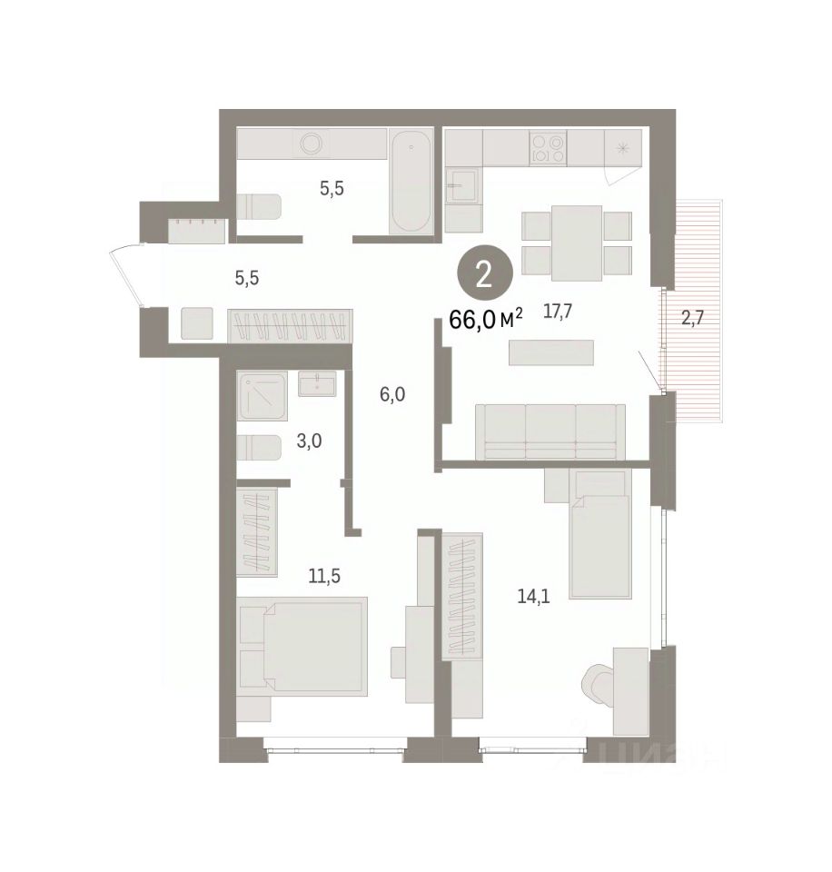 Спешите забронировать по акционной цене! Срок предложения ограничен! Стоимость квартиры указана со скидкой, ваша экономия составит 350,000 RUB. Информация по телефону, наши менеджеры вам все расскажут! 2-комн. квартира с предчистовой отделкой в ЖК ''Квартал Траектория'' на 7 этаже. Общая площадь: 66 кв.м., жилая: 25.6 кв.м., площадь просторной кухни-столовой: 17.7 кв.м. Квартира угловая, очень светлая, естественная вентиляция при открытии окон. В квартире один балкон, два совмещенных санузла. Высота потолков 2.82 м. Дом монолитный, многоподъездный, переменной этажности, от 7 до 16 этажей. Квартира находится в 1-й секции высотой 16 этажей в корпусе 1-2. На этаже 6 квартир. В подъезде 1 пассажирский и 1 грузовой лифт. Начало строительства - 4 квартал 2025 года. Окончание строительства - 4 квартал 2027 года. Оформление сделки по договору долевого участия. Квартира с кухней-гостиной и двумя спальнями в квартале ''Траектория''. Особенности планировки: вид во двор, разнесённые спальни, предчистовая отделка, мастер-спальня, балкон. квартиры в нашей базе: МНВ01-Ж9.7.1. Квартал ''Траектория'' строится в границах улиц Билимбаевской, Расточной, Монтажников и Маневровой Раньше здесь находился оборонный завод 5-ЦАРЗ, основанный в 1945 году. После войны он ремонтировал военную и грузовую технику — от ''Виллисов'' и ''Студебекеров'' до советских ЗИС-5 и ГАЗ-67. Сортировка — район с развитой инфраструктурой, обжитыми жилыми кварталами разных эпох и большим количеством парков. До центра Екатеринбурга — 20 минут на машине. Туда же можно отправиться на автобусе: ближайшая остановка общественного транспорта — в 4 минутах от ''Траектории''. Рядом с ''Траекторией'' расположены магазины, торговый центр, детские сады, школы, поликлиники и полезные сервисы, а также другой проект Брусники — квартал ''Депо''. Если хочется развлечений, можно отправиться в ТРЦ ''Карнавал'' и парк с аттракционами ''Таганская слобода'' — дорога туда займёт не более 10 минут на машине. Квартал ''Траектория'' — первый этап комплексного развития территории, которую раньше занимали производственные здания. На месте бывших цехов Брусника создаст дружелюбную среду и комфортное пешеходное пространство для всего района. Для озеленения квартала мы подобрали больше 60 видов растений: ольху, липу, клён, иву, грушу, вишню, сирень, барбарис, гортензию, смородину, ирис, декоративные травы. Они цветут в разное время года и постоянно меняют настроение двора. В ''Траектории'' мы предусмотрели несколько общественных пространств, открытых для всех горожан: встречающий сквер, лесопарк у храма и событийный сквер между домами. Когда захочется тишины и уединения, можно устроить прогулку во внутренних дворах: в них нет машин и посторонних, зато много зелени, света и мест для отдыха. Каждый двор в квартале ''Траектория'' — продолжение квартиры, только под открытым небом. Здесь можно прогуляться босиком по траве, устроить утреннюю йогу, почитать книгу в гамаке или отправить детей поиграть, не переживая за их безопаснос