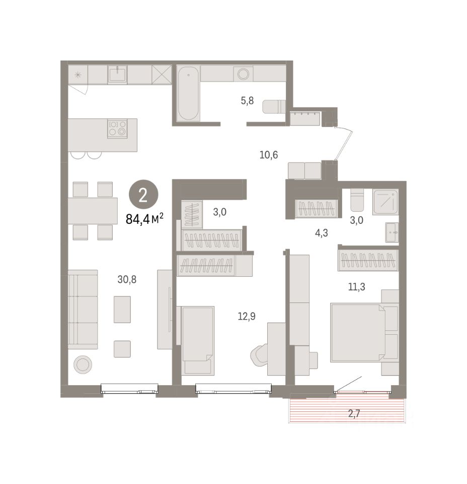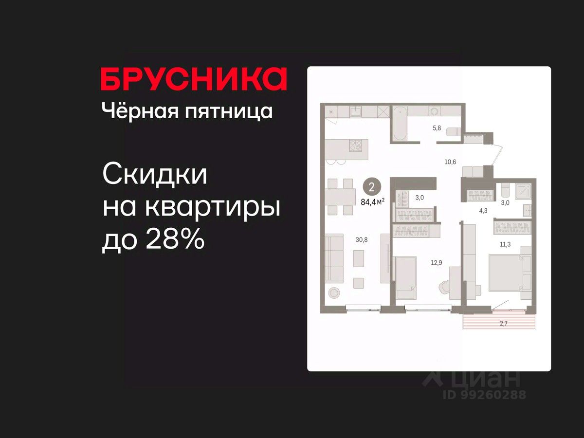 2-комн. квартира с предчистовой отделкой в ЖК ''Квартал Траектория'' на 6 этаже. Общая площадь: 84.4 кв.м., жилая: 24.2 кв.м., площадь просторной кухни-столовой: 30.8 кв.м. Комнаты изолированные, все окна выходят на одну сторону. В квартире один балкон, два совмещенных санузла. Высота потолков 2.82 м. Дом монолитный, многоподъездный, переменной этажности, от 7 до 25 этажей. Квартира находится в 3-й секции высотой 16 этажей в корпусе 1-1. На этаже 7 квартир. В подъезде 1 пассажирский и 1 грузовой лифт. Начало строительства - 4 квартал 2025 года. Окончание строительства - 4 квартал 2027 года. Оформление сделки по договору долевого участия. Квартира с кухней-гостиной и двумя спальнями в квартале ''Траектория''. Особенности планировки: гардеробная, стартовая цена, разнесённые спальни, предчистовая отделка, мастер-спальня, балкон. квартиры в нашей базе: МНВ01-Ж3.6.5. Квартал ''Траектория'' строится в границах улиц Билимбаевской, Расточной, Монтажников и Маневровой Раньше здесь находился оборонный завод 5-ЦАРЗ, основанный в 1945 году. После войны он ремонтировал военную и грузовую технику — от ''Виллисов'' и ''Студебекеров'' до советских ЗИС-5 и ГАЗ-67. Сортировка — район с развитой инфраструктурой, обжитыми жилыми кварталами разных эпох и большим количеством парков. До центра Екатеринбурга — 20 минут на машине. Туда же можно отправиться на автобусе: ближайшая остановка общественного транспорта — в 4 минутах от ''Траектории''. Рядом с ''Траекторией'' расположены магазины, торговый центр, детские сады, школы, поликлиники и полезные сервисы, а также другой проект Брусники — квартал ''Депо''. Если хочется развлечений, можно отправиться в ТРЦ ''Карнавал'' и парк с аттракционами ''Таганская слобода'' — дорога туда займёт не более 10 минут на машине. Квартал ''Траектория'' — первый этап комплексного развития территории, которую раньше занимали производственные здания. На месте бывших цехов Брусника создаст дружелюбную среду и комфортное пешеходное пространство для всего района. Для озеленения квартала мы подобрали больше 60 видов растений: ольху, липу, клён, иву, грушу, вишню, сирень, барбарис, гортензию, смородину, ирис, декоративные травы. Они цветут в разное время года и постоянно меняют настроение двора. В ''Траектории'' мы предусмотрели несколько общественных пространств, открытых для всех горожан: встречающий сквер, лесопарк у храма и событийный сквер между домами. Когда захочется тишины и уединения, можно устроить прогулку во внутренних дворах: в них нет машин и посторонних, зато много зелени, света и мест для отдыха. Каждый двор в квартале ''Траектория'' — продолжение квартиры, только под открытым небом. Здесь можно прогуляться босиком по траве, устроить утреннюю йогу, почитать книгу в гамаке или отправить детей поиграть, не переживая за их безопасность. Мы закроем дворы от машин, чтобы создать безопасную среду для отдыха. Применим натуральные материалы в отделке малых архитектурных форм — дерево, камень, металл без лишней обработки. Внутри каждого д