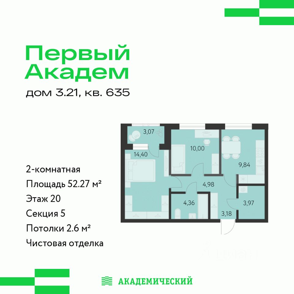 Продается 2-комнатная квартира площадью 52.12 кв.м. от девелопера ''Академический'' в жилом квартале ''Первый Академ''. Срок сдачи дома в 2028 году. Выгоды и скидка напрямую от застройщика. Дом расположен на въезде в район, отличается удобной транспортной развязкой. Рядом новая трамвайная линия и остановка общественного транспорта. Пять домов разной этажности. Эко-тренды во дворах. Холлы и фасады в стиле ар-деко. На территории квартала предусмотрено множество удобств для жильцов, включая видеонаблюдение 24/7, двор без машин, кладовые и подземный паркинг с выходом из лифта, коммерция на первых этажах.