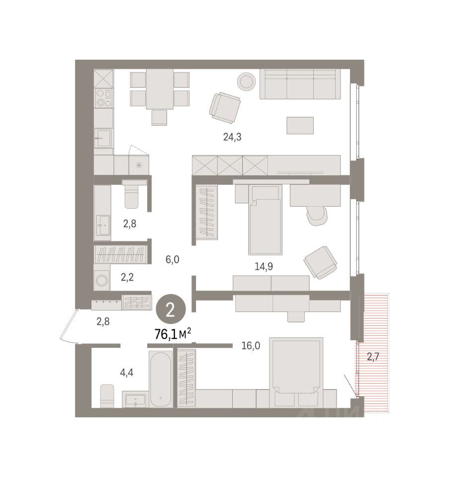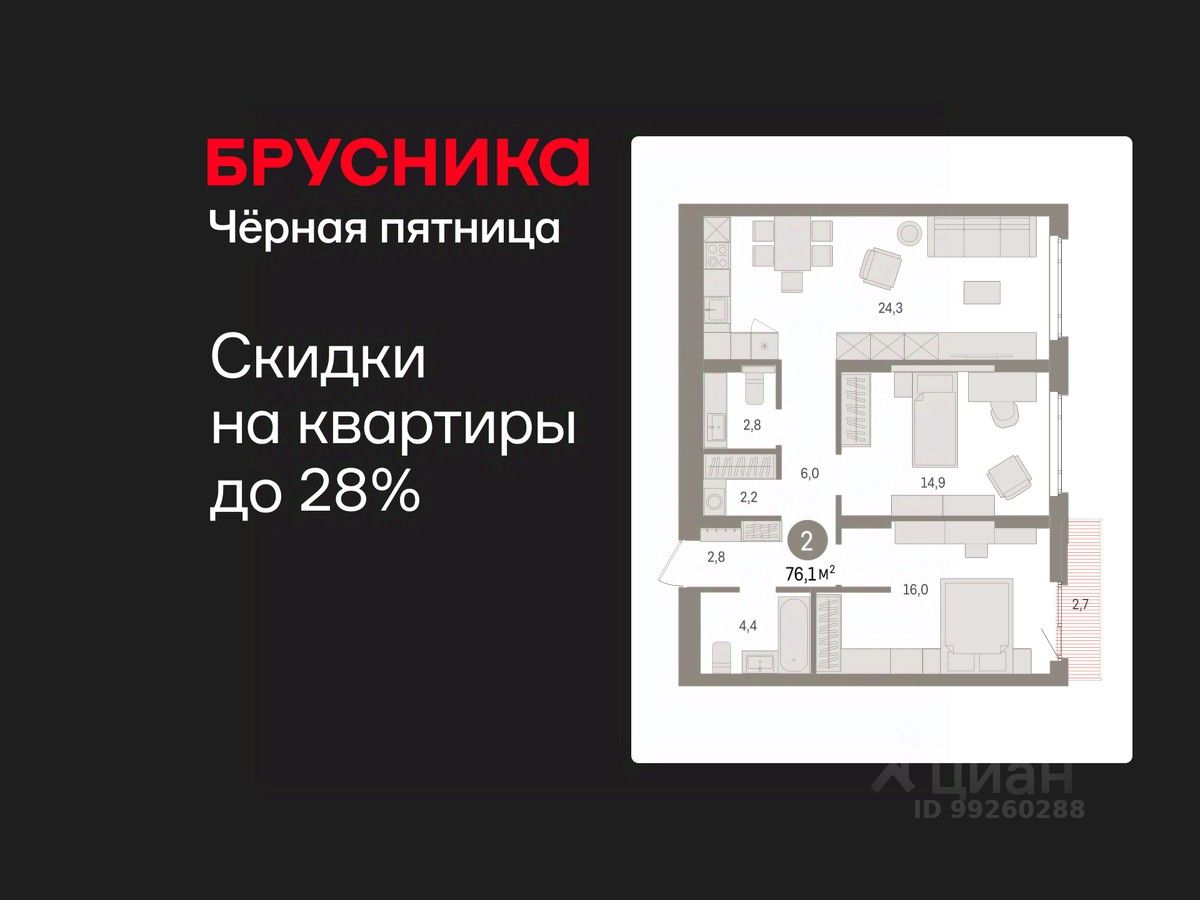 Успейте оформить бронирование на этих условиях! Срок предложения ограничен! Стоимость квартиры указана со скидкой, ваша экономия составит 360,000 RUB. Звоните, наши менеджеры вам все расскажут! Двухкомнатная квартира с предчистовой отделкой в ЖК ''Квартал Траектория'' на 6 этаже. Общая площадь: 76.1 кв.м., жилая: 30.9 кв.м., площадь просторной кухни-столовой: 24.3 кв.м. Комнаты изолированные, все окна выходят на одну сторону. В квартире один балкон, один совмещенный и один раздельный санузел. Высота потолков 2.82 м. Дом монолитный, многоподъездный, переменной этажности, от 7 до 16 этажей. Квартира находится в 1-й секции высотой 16 этажей в корпусе 1-2. На этаже 6 квартир. В подъезде 1 пассажирский и 1 грузовой лифт. Начало строительства - 4 квартал 2025 года. Окончание строительства - 4 квартал 2027 года. Оформление сделки по договору долевого участия. Квартира с кухней-гостиной и двумя спальнями в квартале ''Траектория''. Особенности планировки: второй санузел, гардеробная, вид во двор, разнесённые спальни, предчистовая отделка, балкон. квартиры в нашей базе: МНВ01-Ж9.6.6. Квартал ''Траектория'' строится в границах улиц Билимбаевской, Расточной, Монтажников и Маневровой Раньше здесь находился оборонный завод 5-ЦАРЗ, основанный в 1945 году. После войны он ремонтировал военную и грузовую технику — от ''Виллисов'' и ''Студебекеров'' до советских ЗИС-5 и ГАЗ-67. Сортировка — район с развитой инфраструктурой, обжитыми жилыми кварталами разных эпох и большим количеством парков. До центра Екатеринбурга — 20 минут на машине. Туда же можно отправиться на автобусе: ближайшая остановка общественного транспорта — в 4 минутах от ''Траектории''. Рядом с ''Траекторией'' расположены магазины, торговый центр, детские сады, школы, поликлиники и полезные сервисы, а также другой проект Брусники — квартал ''Депо''. Если хочется развлечений, можно отправиться в ТРЦ ''Карнавал'' и парк с аттракционами ''Таганская слобода'' — дорога туда займёт не более 10 минут на машине. Квартал ''Траектория'' — первый этап комплексного развития территории, которую раньше занимали производственные здания. На месте бывших цехов Брусника создаст дружелюбную среду и комфортное пешеходное пространство для всего района. Для озеленения квартала мы подобрали больше 60 видов растений: ольху, липу, клён, иву, грушу, вишню, сирень, барбарис, гортензию, смородину, ирис, декоративные травы. Они цветут в разное время года и постоянно меняют настроение двора. В ''Траектории'' мы предусмотрели несколько общественных пространств, открытых для всех горожан: встречающий сквер, лесопарк у храма и событийный сквер между домами. Когда захочется тишины и уединения, можно устроить прогулку во внутренних дворах: в них нет машин и посторонних, зато много зелени, света и мест для отдыха. Каждый двор в квартале ''Траектория'' — продолжение квартиры, только под открытым небом. Здесь можно прогуляться босиком по траве, устроить утреннюю йогу, почитать книгу в гамаке или отправить детей поиграть, не переживая за