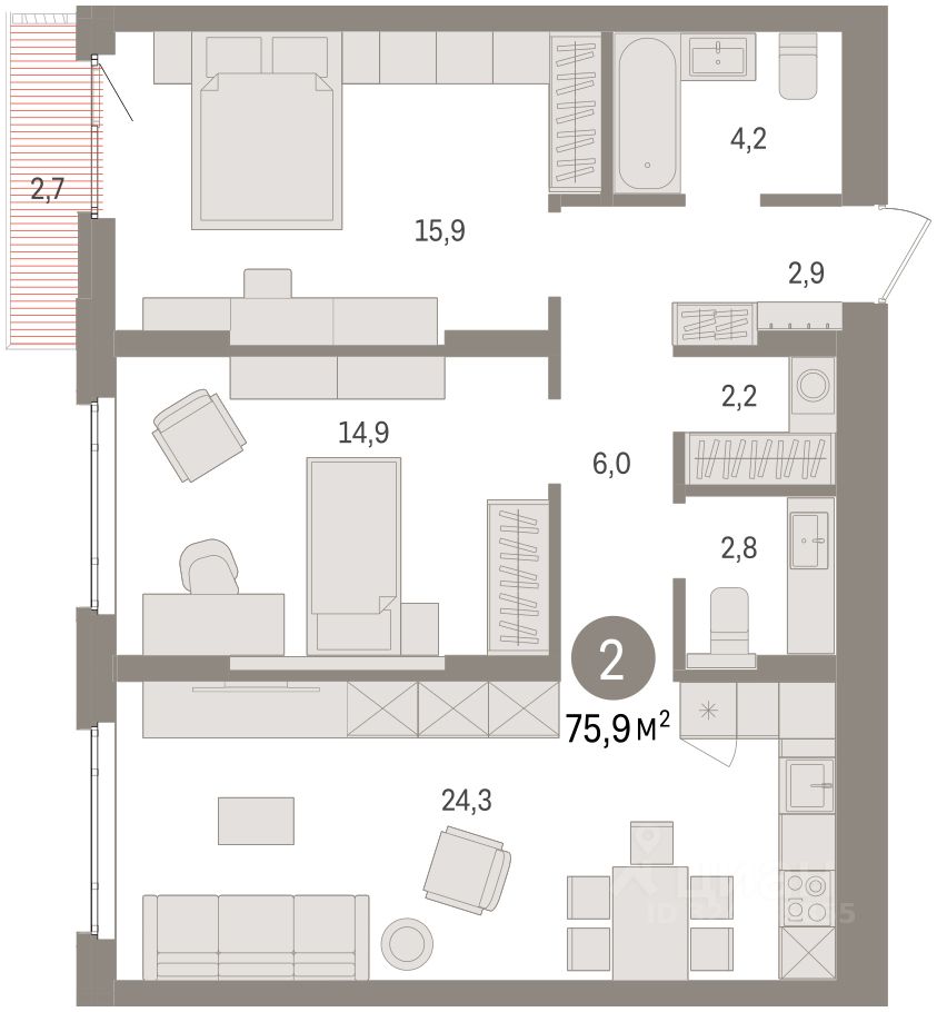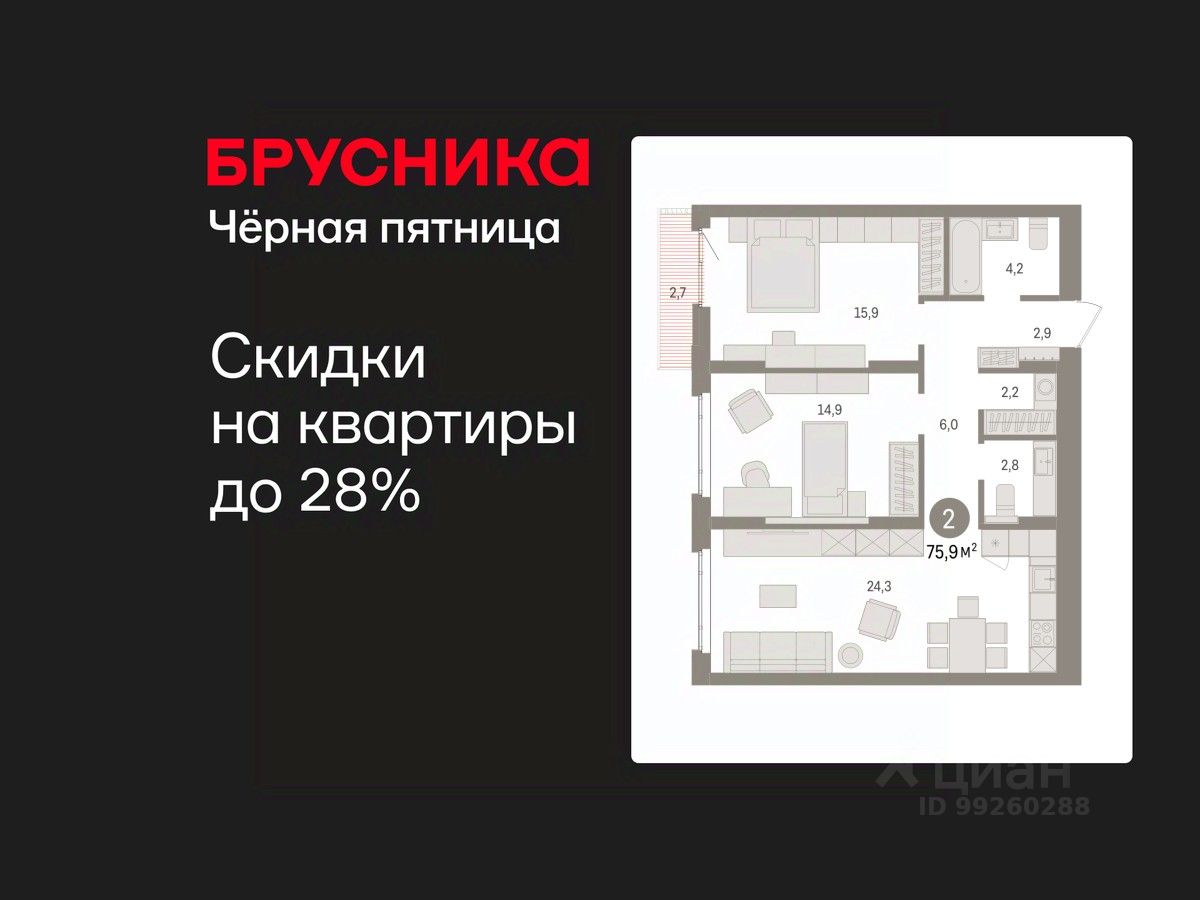 Торопитесь забронировать по акционной цене! Срок предложения ограничен! Стоимость квартиры указана со скидкой, ваша экономия составит 370,000 RUB. Звоните, наши менеджеры вам все расскажут! Просторная 2-комн. квартира с предчистовой отделкой в ЖК ''Квартал Траектория'' на 9 этаже. Общая площадь: 75.9 кв.м. Высота потолков 2.82 м. Дом монолитный, многоподъездный, переменной этажности, от 7 до 16 этажей. Квартира находится в 4-й секции высотой 16 этажей в корпусе 1-2. На этаже 7 квартир. В подъезде 1 пассажирский и 1 грузовой лифт. Начало строительства - 4 квартал 2025 года. Окончание строительства - 4 квартал 2027 года. Оформление сделки по договору долевого участия. Квартира с кухней-гостиной и двумя спальнями в квартале ''Траектория''. Особенности планировки: второй санузел, гардеробная, вид во двор, разнесённые спальни, предчистовая отделка, балкон. квартиры в нашей базе: МНВ01-Ж12.9.6. Квартал ''Траектория'' строится в границах улиц Билимбаевской, Расточной, Монтажников и Маневровой Раньше здесь находился оборонный завод 5-ЦАРЗ, основанный в 1945 году. После войны он ремонтировал военную и грузовую технику — от ''Виллисов'' и ''Студебекеров'' до советских ЗИС-5 и ГАЗ-67. Сортировка — район с развитой инфраструктурой, обжитыми жилыми кварталами разных эпох и большим количеством парков. До центра Екатеринбурга — 20 минут на машине. Туда же можно отправиться на автобусе: ближайшая остановка общественного транспорта — в 4 минутах от ''Траектории''. Рядом с ''Траекторией'' расположены магазины, торговый центр, детские сады, школы, поликлиники и полезные сервисы, а также другой проект Брусники — квартал ''Депо''. Если хочется развлечений, можно отправиться в ТРЦ ''Карнавал'' и парк с аттракционами ''Таганская слобода'' — дорога туда займёт не более 10 минут на машине. Квартал ''Траектория'' — первый этап комплексного развития территории, которую раньше занимали производственные здания. На месте бывших цехов Брусника создаст дружелюбную среду и комфортное пешеходное пространство для всего района. Для озеленения квартала мы подобрали больше 60 видов растений: ольху, липу, клён, иву, грушу, вишню, сирень, барбарис, гортензию, смородину, ирис, декоративные травы. Они цветут в разное время года и постоянно меняют настроение двора. В ''Траектории'' мы предусмотрели несколько общественных пространств, открытых для всех горожан: встречающий сквер, лесопарк у храма и событийный сквер между домами. Когда захочется тишины и уединения, можно устроить прогулку во внутренних дворах: в них нет машин и посторонних, зато много зелени, света и мест для отдыха. Каждый двор в квартале ''Траектория'' — продолжение квартиры, только под открытым небом. Здесь можно прогуляться босиком по траве, устроить утреннюю йогу, почитать книгу в гамаке или отправить детей поиграть, не переживая за их безопасность. Мы закроем дворы от машин, чтобы создать безопасную среду для отдыха. Применим натуральные материалы в отделке малых архитектурных форм — дерево, камень, металл без лишн