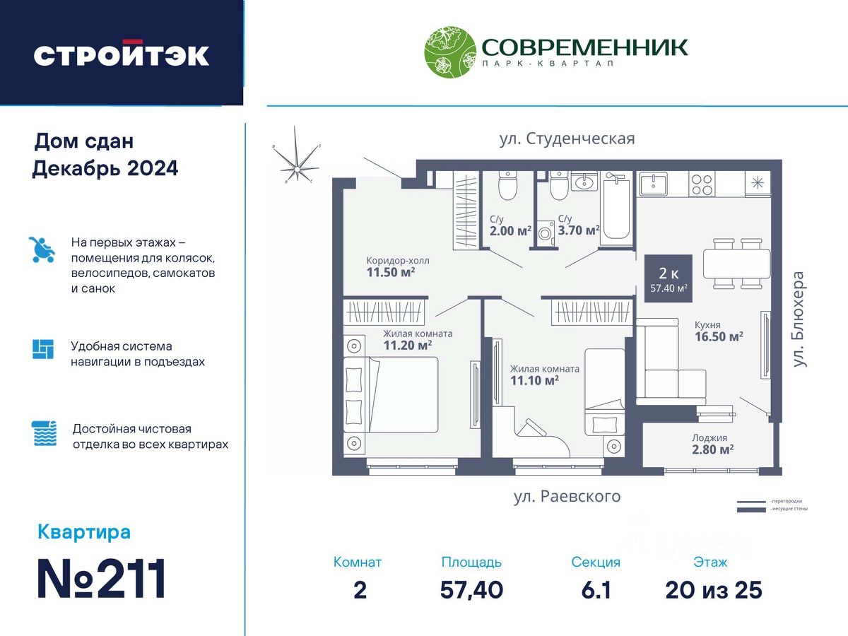 Жилой комплекс ''Современник-6 дом'' (секция 6.1) ''Современник'' — жилой квартал из 8 очередей строительства, расположенный на пересечении улиц Блюхера, Раевского, Комвузовской и Студенческой. Шестая очередь строительства включает 2 отдельных дома в глубине квартала. Дома сданы. Продажа квартир осуществляется по договору купли-продажи от застройщика. Сердце комплекса — ландшафтный парк площадью 1 гектар, оборудованный прогулочными маршрутами и детскими площадками. В 10 минутах на машине проспект Ленина, в пешей доступности — Шарташский лесопарк. Здесь вы можете приобрести машино-места в подземном паркинге и келлеры — кладовые комнаты. Кроме того, чистовая отделка в квартирах этой очереди выполнена по улучшенному стандарту ''Комфорт +'' с применением более функциональных и престижных материалов и решений. Район Кировский район — вблизи от динамичного центра, при этом в ''Современнике'' — своя атмосфера уюта и комфорта. Рядом с домом — лесопарк с озером Шарташ. Вблизи 5 школ, 3 детских сада и 3 вуза В пешей доступности Центр футбольной подготовки, фитнес-клубы и спортивный комбинат ''Урал'' ''Пятёрочка'', ''Магнит'' и ''Перекрёсток'' — в нескольких минутах ходьбы До торговых центров ''Современник'', ''Апельсин'' и ''Парк Хаус'' — 5-10 минут на машине Неподалёку — Дендрологический и Основинский парки, а также парк имени Блюхера Двор В ландшафтном парке кроме детских площадок вас ждут спортплощадки для футбола и стритбола, воркаут-комплекс и даже крытый деревянный амфитеатр для праздников или отдыха в жаркую погоду. Но это не всё. Закрытая территория с охраной Двор без машин, можно заехать только для погрузки-разгрузки Круглосуточное видеонаблюдение Подземный паркинг с машиноместами разной площади и доступом на лифте из подъезда Освещение всей территории парка-квартала Подъезд Доступ в подъезд на уровне земли — без барьеров Домофоны — в тёплых остеклённых тамбурах Удобная система навигации Помещения для колясок и самокатов на 1 этаже Сквозной вход — с внешней стороны улицы и со двора Планировки Объединённые кухни-гостиные для простора 3D-модели с вариантами обстановки Отказ от бесполезных ''мёртвых'' зон Отделка Улучшенный стандарт отделки ''Комфорт +'' На полу в комнатах, прихожих и кухнях ламинат 33 класса повышенной прочности, в ванной и туалете - плитка, на стенах виниловые обои на флизелиновой основе, потолки в комнатах, лоджиях и кухнях окрашенные, в коридорах, прихожих и санузлах натяжные Двухкамерные стеклопакеты с приточными клапанами вентиляции и детскими замками Оконные стёкла Energy light с покрытием из соединений серебра — минимум тепловых потерь, защита от вредного излучения и лучшая освещённость Межкомнатные двери и плинтусы белого цвета, усиленная сейф-дверь на входе в квартиру В санузлах установлены раковины и унитазы, а во всей квартире — розетки и выключатели Радиаторы с терморегуляторами и горизонтальной разводкой Приборы учета электроэнергии, отопления и водоснабжения