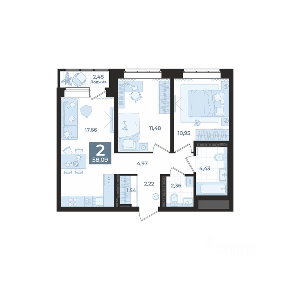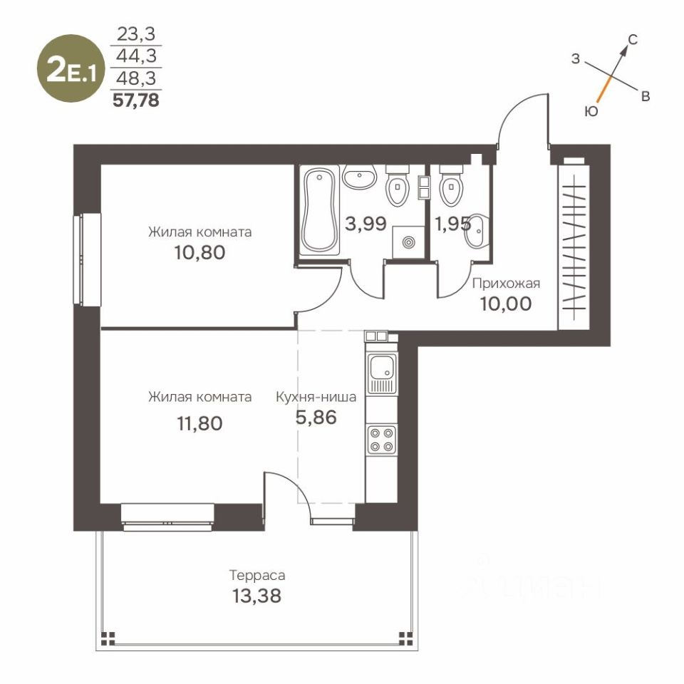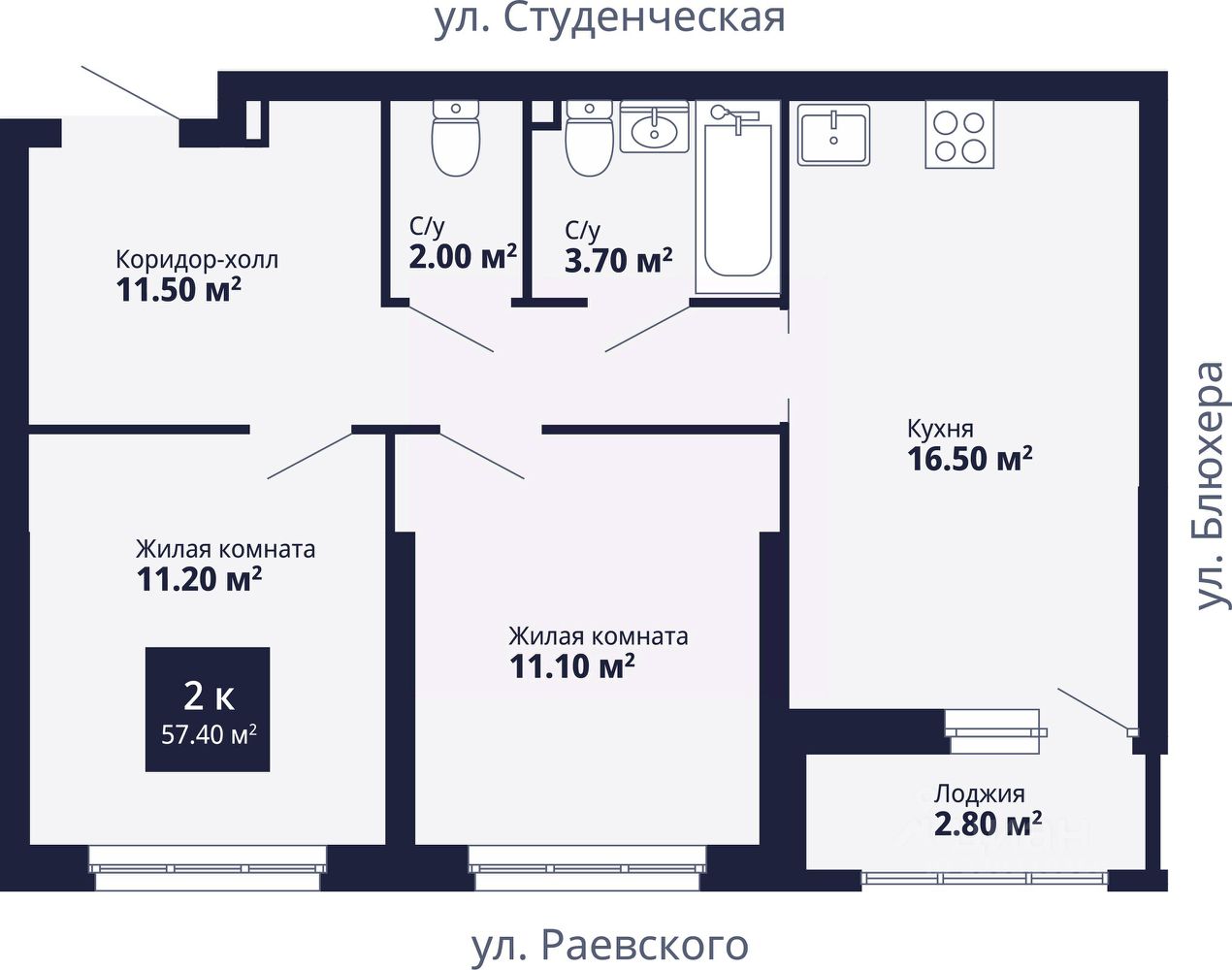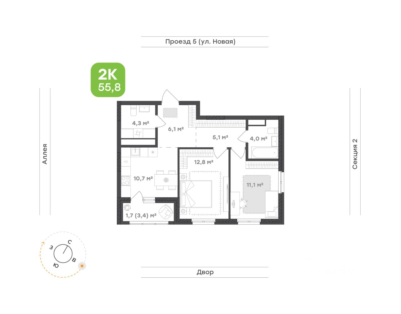 Двухкомнатная квартира для современной семьи Отдельная кухня 10,7 м² с выходом на лоджию 3,4 м² открывает завораживающий вид на двор, наполняя пространство естественным светом и создавая атмосферу лёгкости Родительская спальня 12,8 м² с местом под шкаф становится уютным уголком для отдыха, обеспечивая идеальное сочетание приватности и функциональности Комната 11,1 м², которую можно использовать как детскую или кабинет, с продуманными местами под хранение, позволяющими легко организовать пространство Два санузла один 4,3 м² с местом под душевую кабину для быстрого освежения и стиральную машину, и второй 4,0 м² с местом под ванну для расслабляющих процедур отвечают всем требованиям современной жизни В прихожей 6,1 м² с системой хранения каждая вещь найдёт своё место Коридор 5,1 м² логично объединяет все зоны квартиры и создаёт дополнительное пространство для организации порядка и размещения шкафа-купе