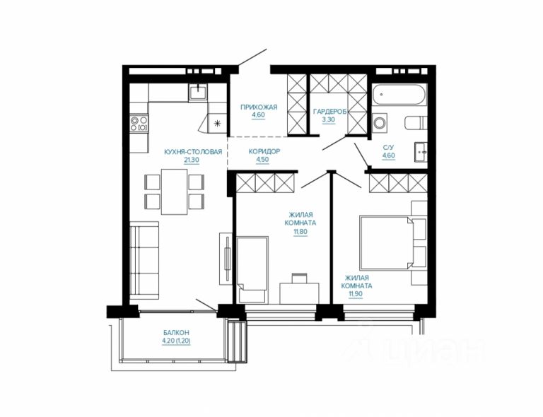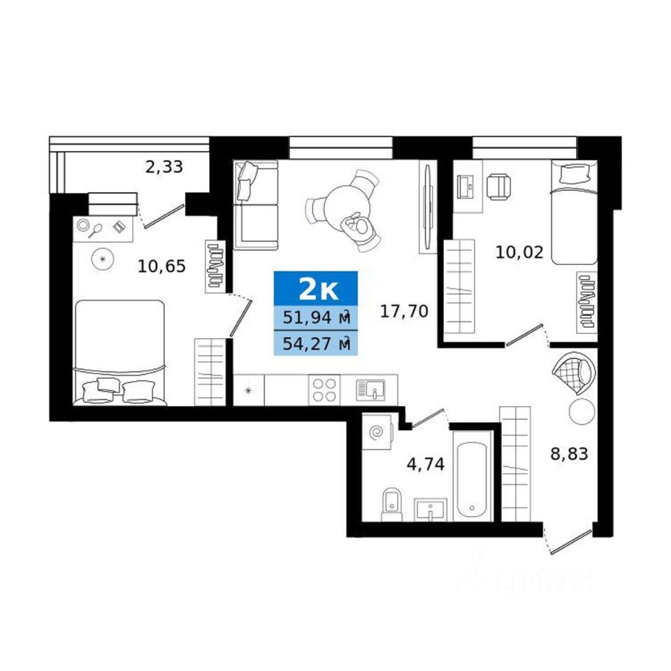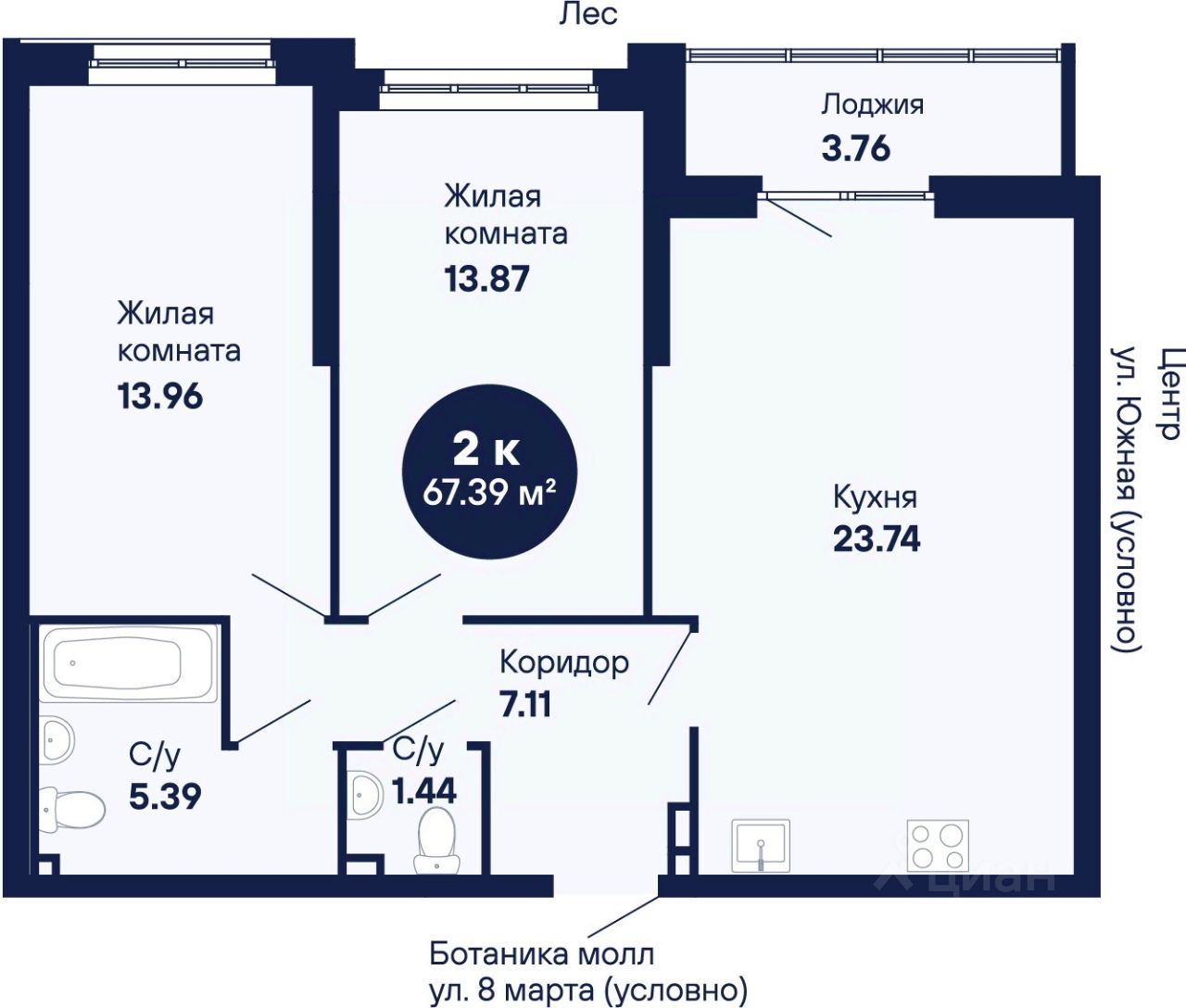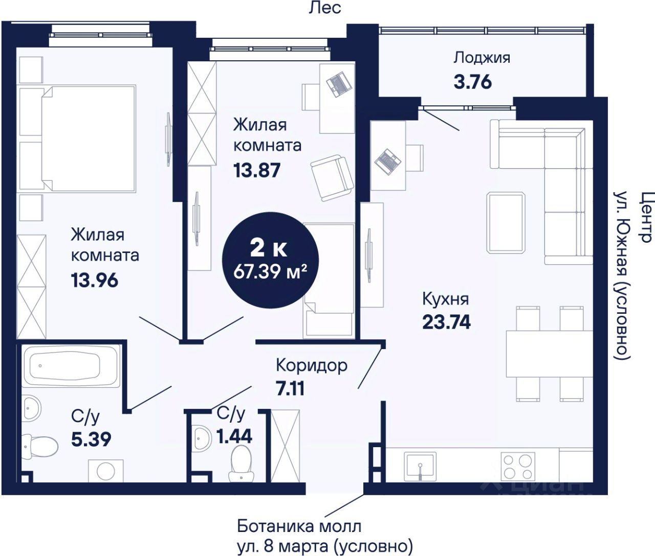 Двухкомнатная квартира для современной семьи Отдельная кухня 10,7 м² с выходом на лоджию 3,4 м² открывает завораживающий вид на двор, наполняя пространство естественным светом и создавая атмосферу лёгкости Родительская спальня 12,8 м² с местом под шкаф становится уютным уголком для отдыха, обеспечивая идеальное сочетание приватности и функциональности Комната 11,1 м², которую можно использовать как детскую или кабинет, с продуманными местами под хранение, позволяющими легко организовать пространство Два санузла один 4,3 м² с местом под душевую кабину для быстрого освежения и стиральную машину, и второй 4,0 м² с местом под ванну для расслабляющих процедур отвечают всем требованиям современной жизни В прихожей 6,1 м² с системой хранения каждая вещь найдёт своё место Коридор 5,1 м² логично объединяет все зоны квартиры и создаёт дополнительное пространство для организации порядка и размещения шкафа-купе