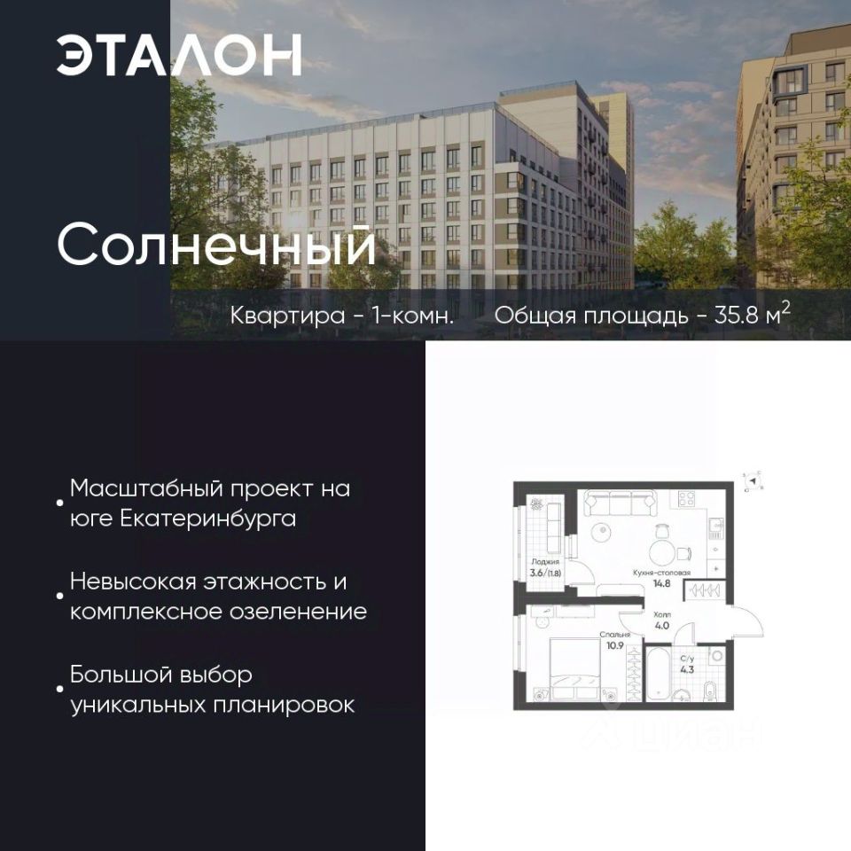 Продается квартира 310, по адресу Свердловская обл., г. Екатеринбург, Чкаловский район, корпус Солнечный, блок 6.3 в Солнечный на 6 этаже, с площадью 35.8 м2.