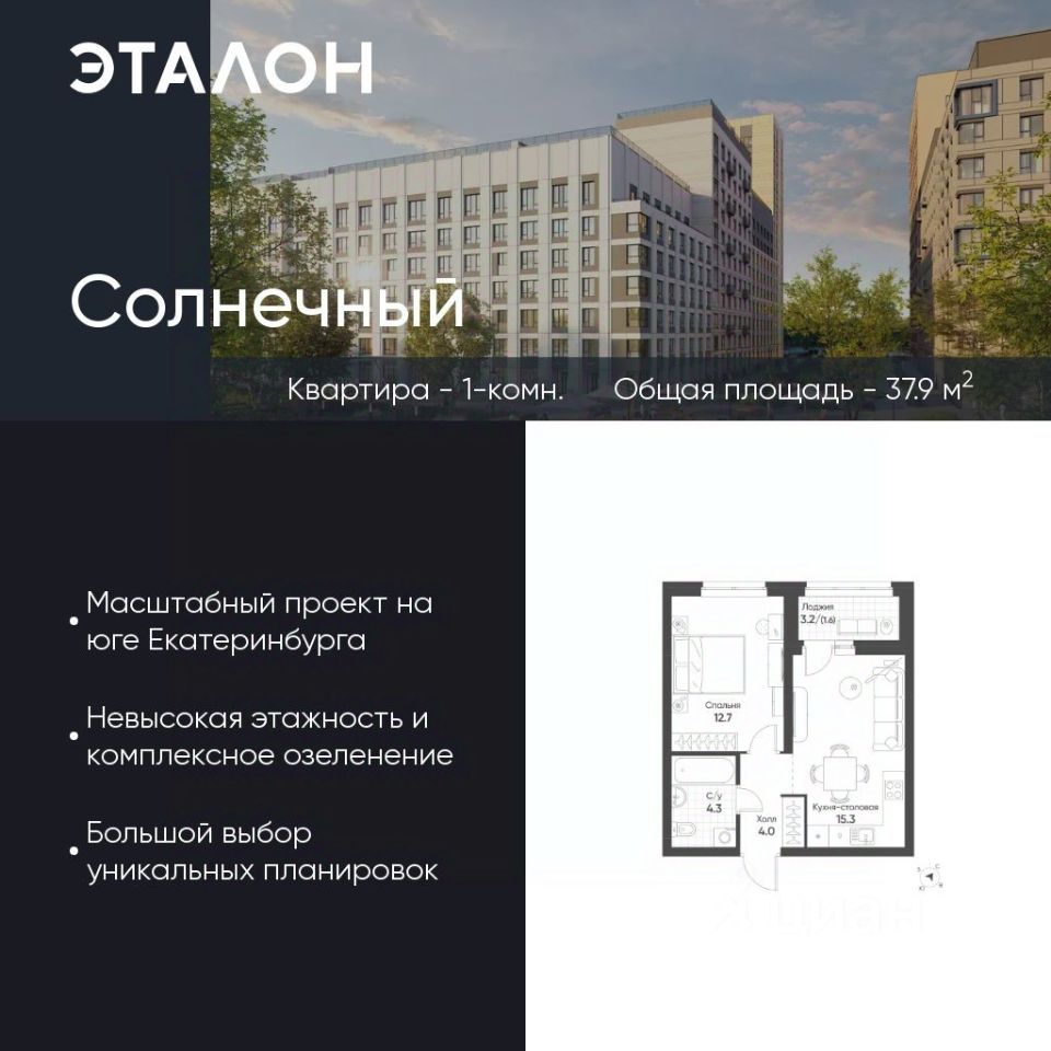 Продается квартира 313, по адресу Свердловская обл., г. Екатеринбург, Чкаловский район, корпус Солнечный, блок 6.3 в Солнечный на 6 этаже, с площадью 37.9 м2.