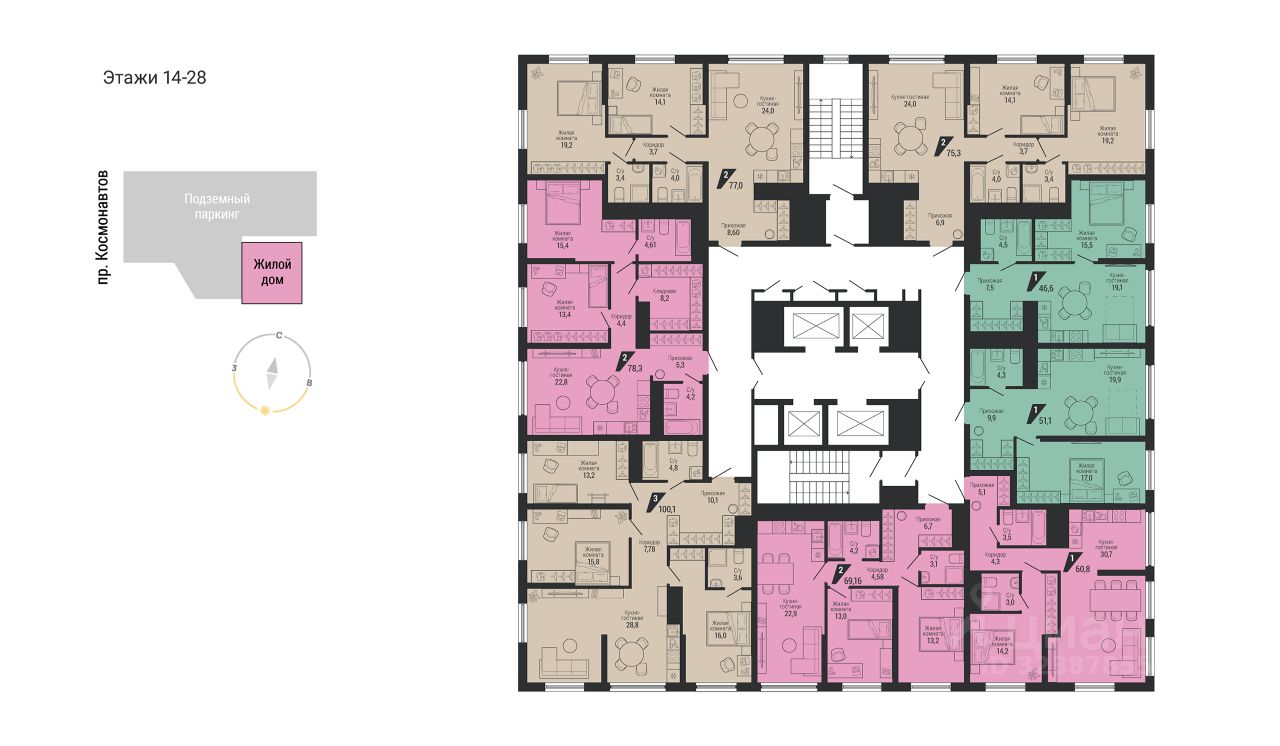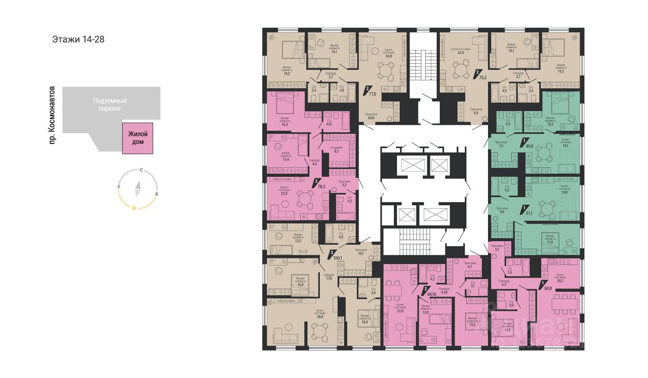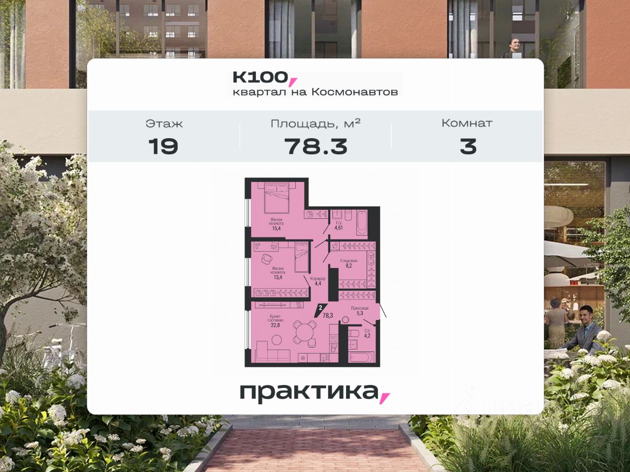 Жилой квартал ''К100'' на Космонавтов, 100 будет состоять из трех монолитно-кирпичных домов, объединенных общим двором. Застройщик компания ''Практика''. Планировки начинаются от 44,8 м² и доходят до 159,5 м². На каждом этаже располагается от восьми квартир классического и евроформата от двух до пяти комнат. Застройщик предлагает два вида отделки: white box и чистовую. Есть возможность перепланировки. Двор с ландшафтным озеленением разделен на три зоны. Для детей игровые площадки с меловыми досками и уличными шахматами, для взрослых лаунж-зона с креслами и столиками для отдыха, для спортсменов воркаут-площадка. На первом этаже лобби-клуб с игровыми комнатами, залом для йоги, коворкингом и мини-кинотеатром, колясочные и велосипедные помещения. Для автомобилистов предусмотрены гостевые места и подземный паркинг с доступом на лифте. На всей территории жилого комплекса установят видеонаблюдение. В доме будет работать консьерж-сервис в режиме 24/7. Дополнительные услуги включают клининг, выгул домашних животных, доставку еды из ресторанов и вызов такси. Также предусмотрена система ''Умный дом''. Рядом с жилым комплексом находятся сосновый бор, школы, детские сады, медицинские учреждения, торговые центры и супермаркеты, остановки общественного транспорта и станция метро. В шаговой доступности от дома откроется новый корпус уникальной гимназии ''Арт-Этюд'' — многопрофильного центра общего и художественного образования для детей от 3 до 18 лет. Строительство первой очереди жилого квартала ''К100'' на Космонавтов, 100 завершится в четвертом квартале 2026 года.
