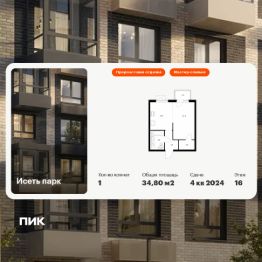 Продаётся 1-комн. квартира площадью 34,8 кв.м на 16 этаже 24 этажного дома (Корпус 4, Секция 1) проекта ПИК Исеть парк. Светлый просторный подъезд на уровне земли, функциональная планировка, большие окна, предчистовая отделка. ''Исеть парк'' возводится в Октябрьском районе Екатеринбурга — на берегу реки Исеть в окружении трёх крупных лесопарков. До метро ''Ботаническая'' можно дойти за 15 минут, а дорога на автомобиле до центра города занимает 20 минут. Проект включает шесть домов и многоуровневый паркинг. На первых этажах открываются кафе, магазины и полезные сервисы. А в уютных дворах-парках есть детские и спортивные площадки. Район хорошо развит: есть школы и детские сады, магазины и поликлиники. Ещё здесь находится большой развлекательный комплекс с аквапарком ''Лимпопо'' и крупнейший на Урале океанариум, городской зоопарк и Академический театр оперы и балета. Артикул 869747 (Застройщик ООО ''СЗ ''Столица'')