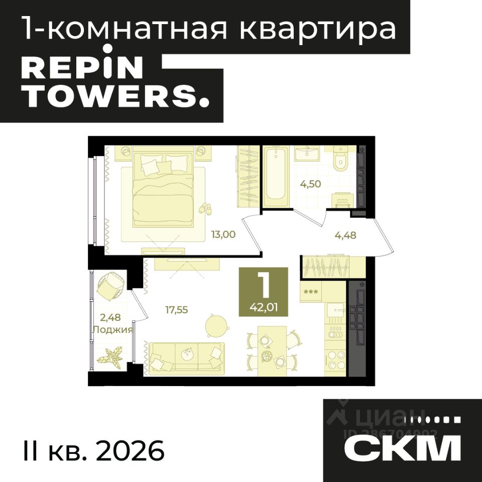 Дом 2 Ввод в эксплуатацию первая половина 2026 г. (возможен досрочный ввод). Класс дома: комфорт. Отделка: чистовая. Архитектурное решение: графитовые композитные панели в сочетании со светлой штукатуркой. Вид из окон: на Верх-Исетский пруд, центр города и лесной массив. ЖК Repin Towers три башни разной этажности объединённые общим двором. Комплекс расположен на пересечение улиц Репина Заводская. На территории запроектирован детский сад, до школы около 100 метров, пересекать проезжую часть не придется. В шаговой доступности находятся: