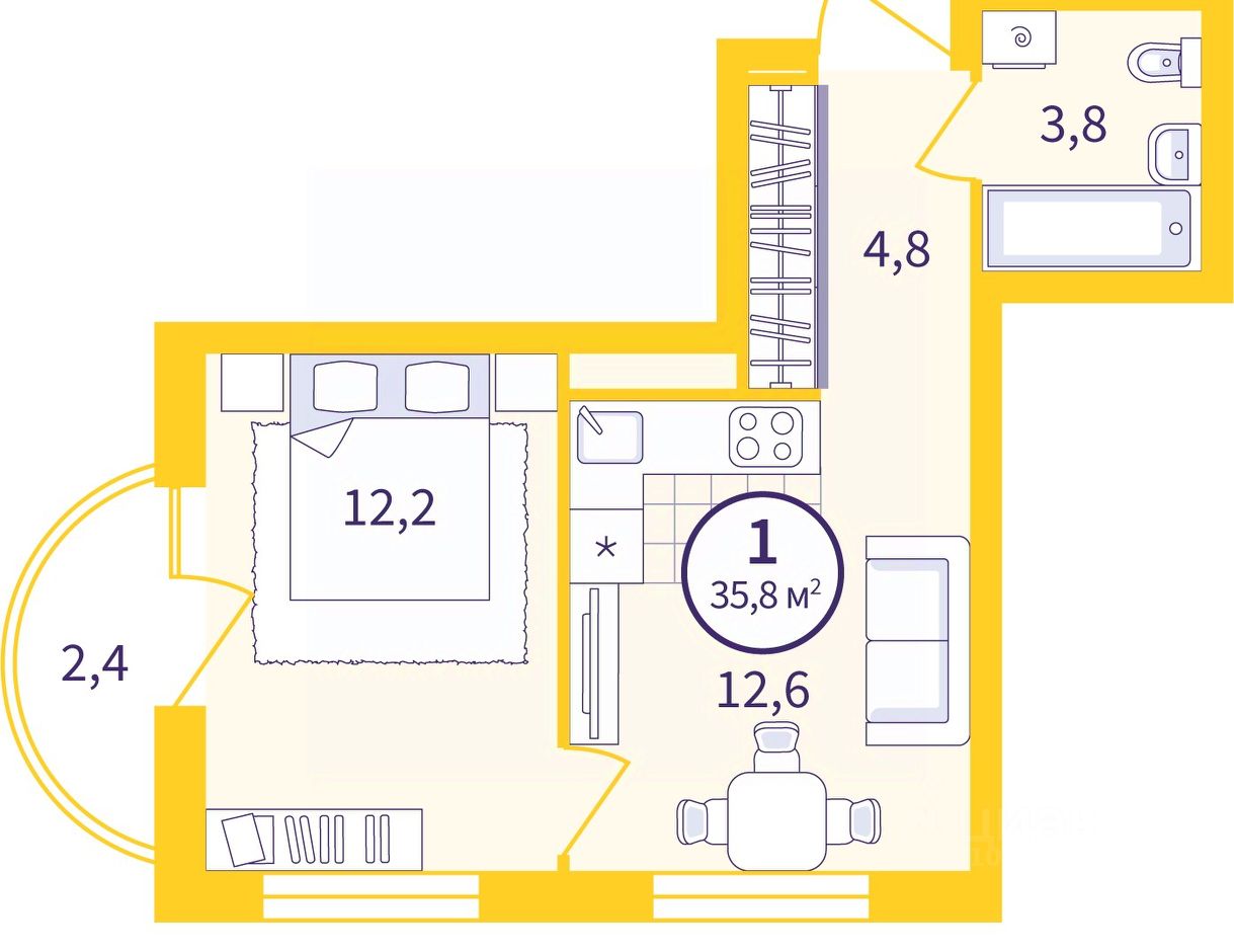 Продается однокомнатная квартира с предчистовой отделкой в ЖК ''Астон.Движение'' на 5 этаже. Общая площадь: 34.07 кв.м., жилая: 12.2 кв.м., площадь просторной кухни-столовой: 12.6 кв.м. Квартира угловая, очень светлая, естественная вентиляция при открытии окон. В квартире один балкон, один совмещенный санузел. Высота потолков 2.7 м.