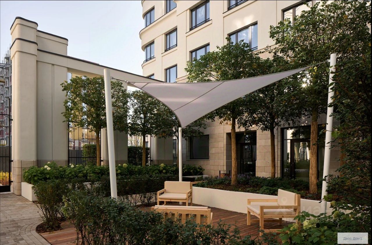 Вход во двор организован через колоннаду. Планировочно он разделён на две части. Парадный партер с большим количеством стриженых растений, фонтанами, цветущими кустарниками и более ''домашняя'', уютная зона, где высажены деревья и низкорослые хвойные растения, многолетники. В центре двора — две детские площадки. #25oOMd