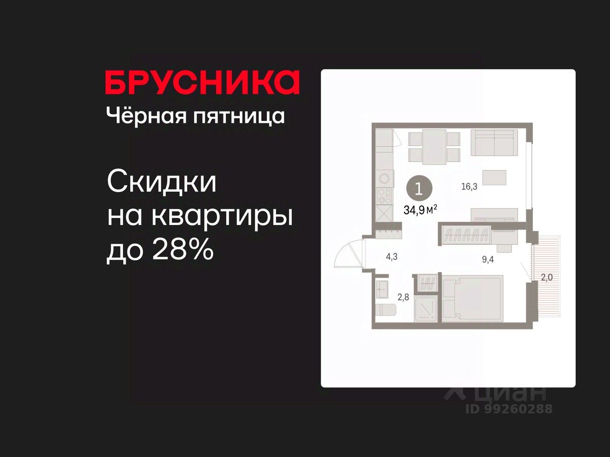 Квартира с кухней-гостиной и одной спальней в Бруснике в Академическом. Особенности планировки: вид во двор, предчистовая отделка, балкон. квартиры в нашей базе: АКД05-Ж8.3.1.