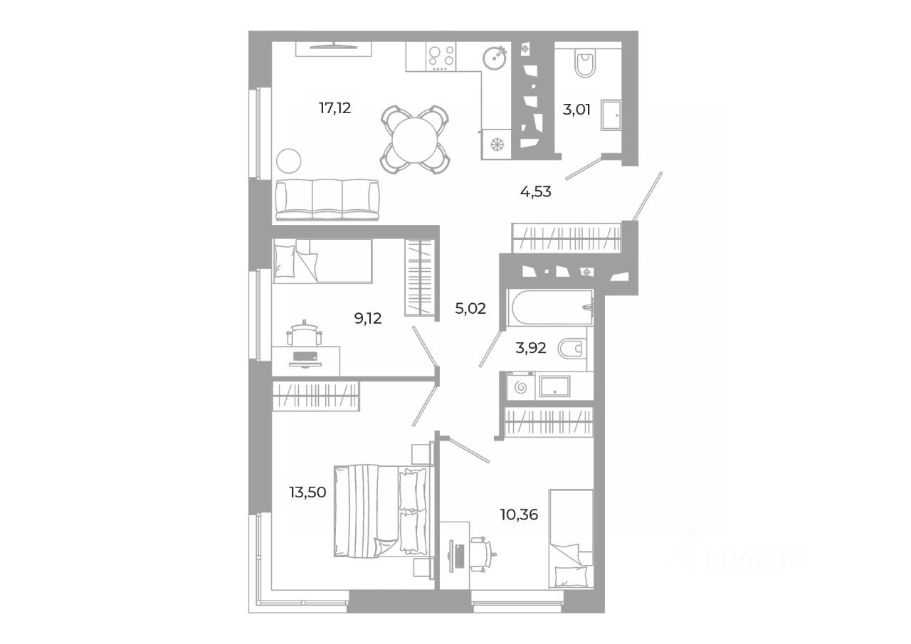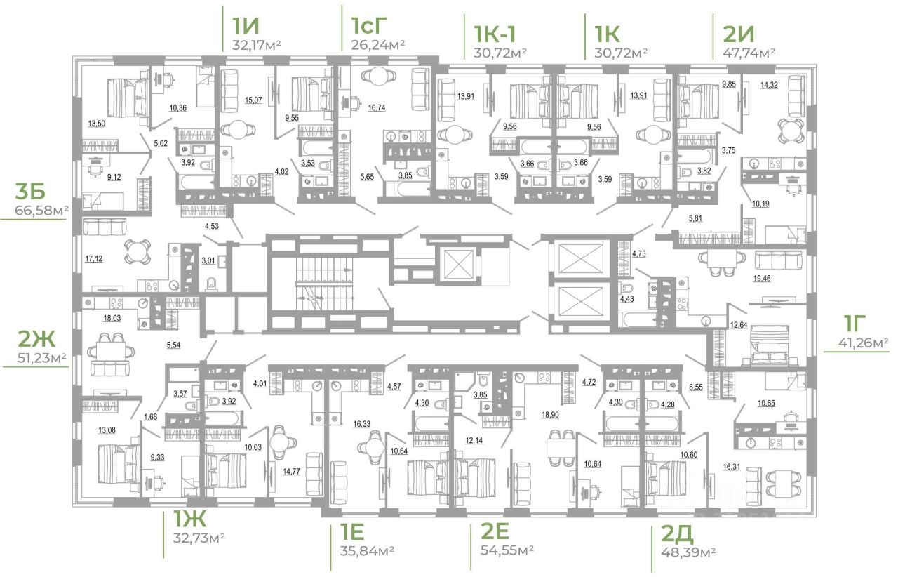 - Кладовые помещения на каждом этаже и на -1 этаже. В проекте 25 планировочных решений: от уютных студий от 21,51 м² до квартир с тремя спальнями и кухней-гостиной до 66,58 м² с функциональным разделением на гостевую и приватные зоны.