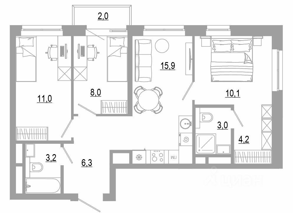 В комплексе представлено 25 планировок с площадью квартир от 21 м² до 65 м² для разных жизненных сценариев жизни:
