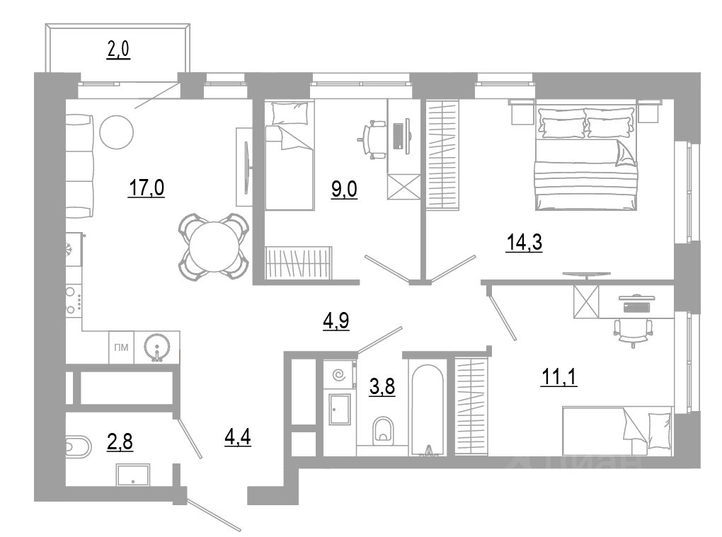 В комплексе представлено 25 планировок с площадью квартир от 21 м² до 65 м² для разных жизненных сценариев жизни: