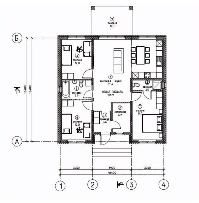 В доме 3 спальни , бoльшая кухня - гостиная c выходом на террасу.
