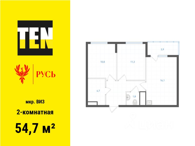 Общая площадь54,7 м2