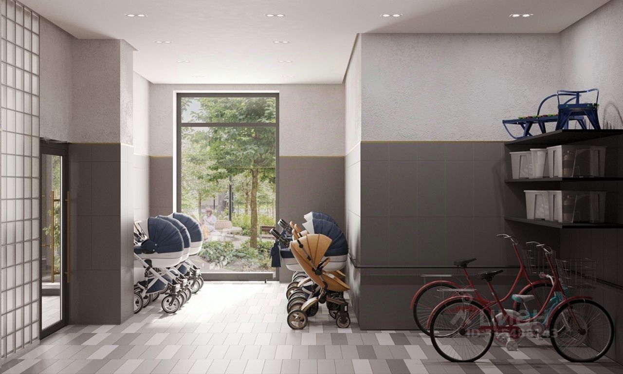 На первом этаже предусмотрена колясочная для хранения малогабаритного транспорта и снаряжения, доступная только для жителей. В гостевых санузлах также находятся лапомойки для четвероногих друзей и жителей дома.