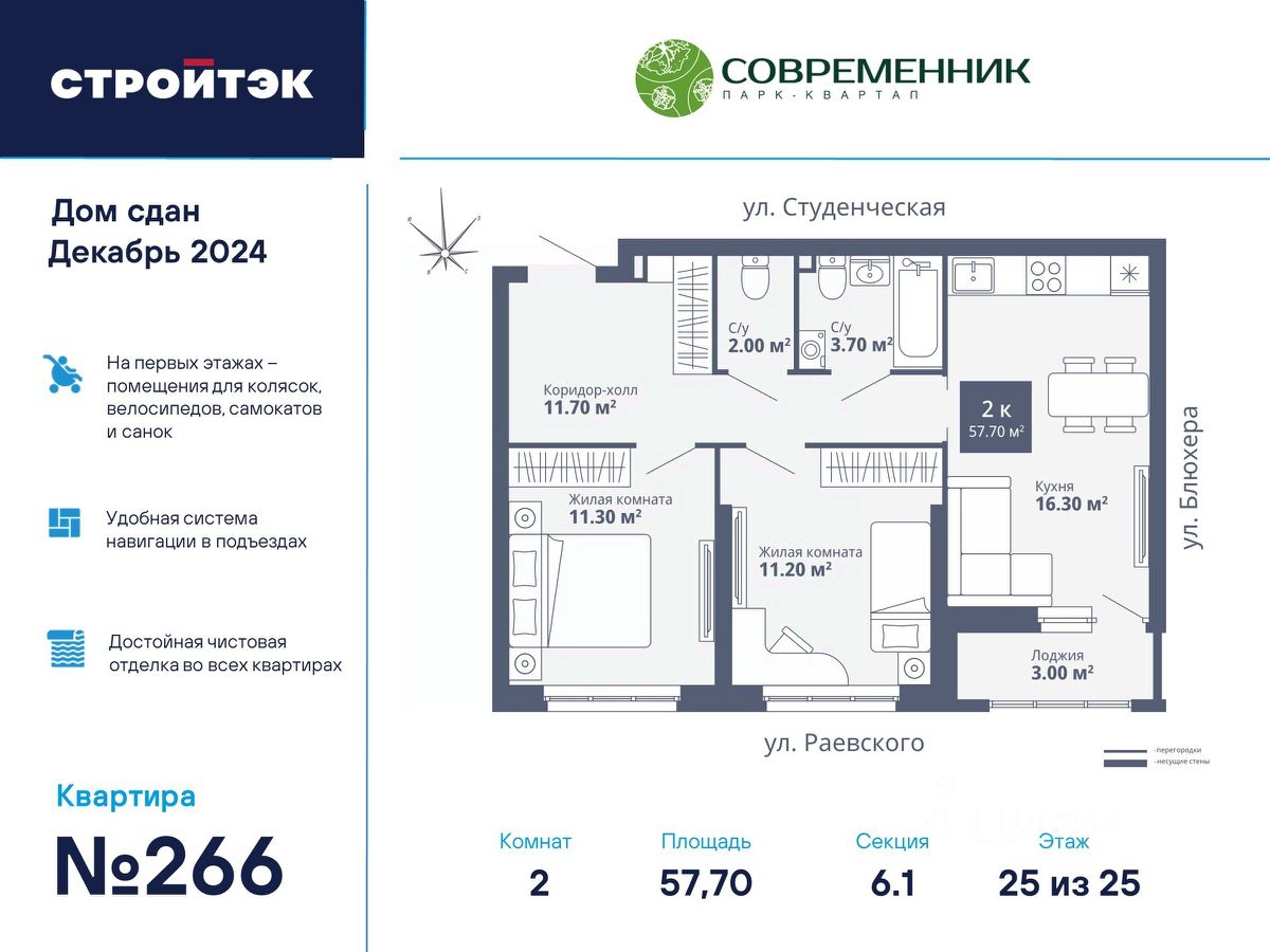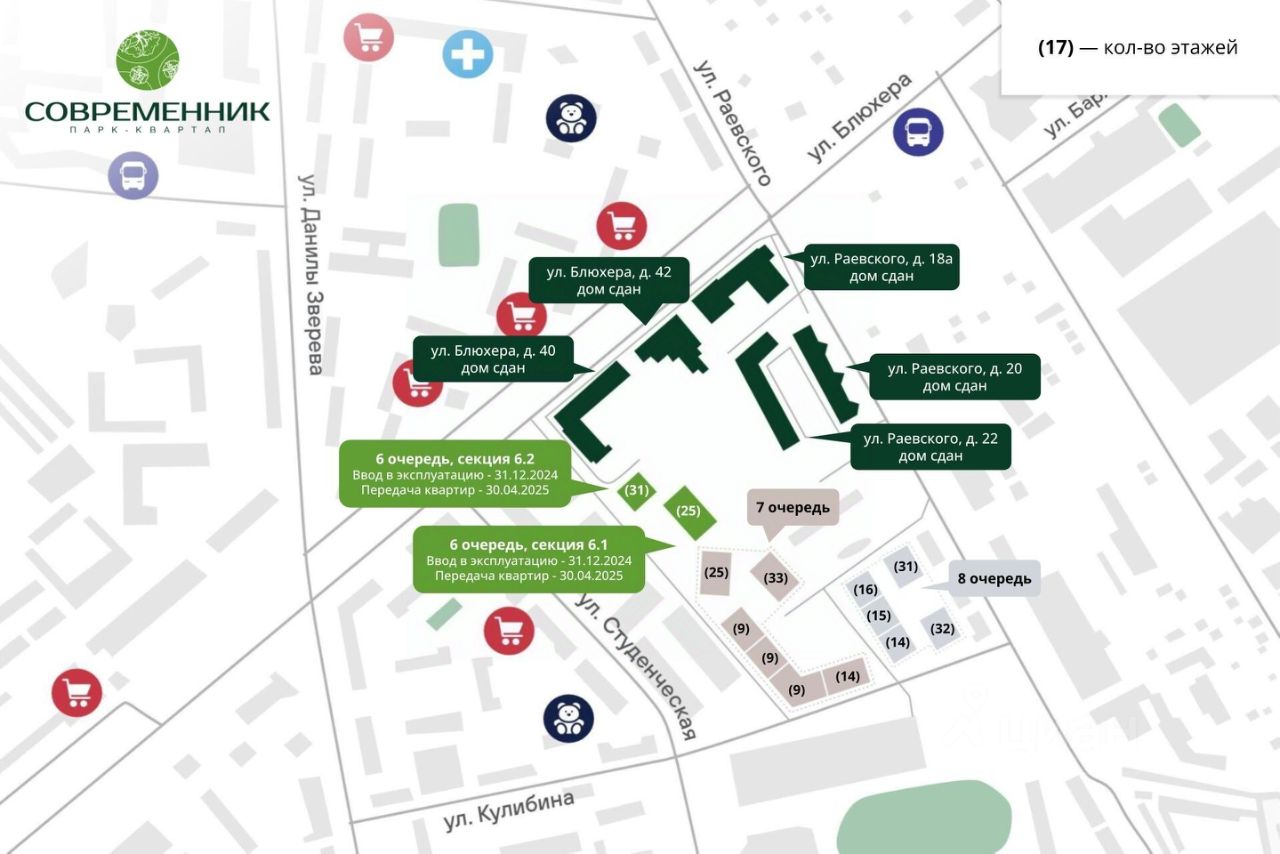 Жилой комплекс ''Современник-6 дом'' (секция 6.1) ''Современник'' — жилой квартал из 8 очередей строительства, расположенный на пересечении улиц Блюхера, Раевского, Комвузовской и Студенческой. Шестая очередь строительства включает 2 отдельных дома в глубине квартала. Дома сданы. Продажа квартир осуществляется по договору купли-продажи от застройщика. Сердце комплекса — ландшафтный парк площадью 1 гектар, оборудованный прогулочными маршрутами и детскими площадками. В 10 минутах на машине проспект Ленина, в пешей доступности — Шарташский лесопарк. Здесь вы можете приобрести машино-места в подземном паркинге и келлеры — кладовые комнаты.
