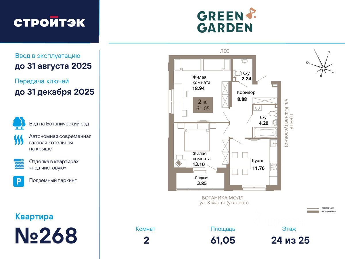 Жилой комплекс Green Garden (Грин Гарден) расположен в микрорайоне Ботанический, в сердце Ботанического сада — по адресу 8 марта, 204е. Дом сдан. Продажа квартир осуществляется по договору купли-продажи от застройщика. Район Экологичный Ботанический микрорайон — один из самых молодых, и при этом развитых в городе. 100-летний Ботанический сад — прямо у дома 5 минут пешком до остановки транспорта 8 минут пешком до ''Ботаники Молл'' 10 минут на машине до центра города 2 км через парк — до метро ''Ботаническая'' 6 школ и 7 детсада поблизости Двор Кроме привычных элементов окружения, у дома — современная автономная газовая котельная на крыше — независимая, экономичная и безопасная. Концепция ''Двор без машин'', когда можно заехать только для разгрузки и погрузки Закрытая и освещённая территория без посторонних Круглосуточное видеонаблюдение Собственный сад с деревьями и кустарниками Детские и спортивные площадки, места для отдыха и мероприятий Подземный паркинг на 114 мест Подъезды Богатое и утончённое оформление холлов, удобная мягкая мебель, информативная навигация, стойка ресепшн и радушный консьерж. И это — не всё. Доступ в подъезд на уровне земли — без барьеров Домофон в тёплом остеклённом тамбуре 4 лифта, 2 из которых — грузовые Помещения для колясок и самокатов на 1 этаже Комната гигиены, чтобы помыть руки или лапы Планировки Обратите внимание на варианты с тёплыми лоджиями панорамного остекления, а также с террасами на первом этаже. В остальном — наш золотой стандарт — подход ''Разумные метры''. Объединённые кухни-гостиные для простора и общения Отказ от бесполезных зон Отделка В Green Garden (Грин Гарден) мы предоставили вам свободу для творчества и выполнили отделку ''под чистовую''. На полу цементно-песчаная стяжка, на стенах — штукатурка, на потолках балконов — краска Усиленная сейф-дверь на входе в квартиру, на балконах и лоджиях — остекление В санузлах установлены унитазы, раковины и смесители, а во всей квартире — розетки и выключатели Радиаторы с терморегуляторами и горизонтальной разводкой Естественная вытяжка с механическим побуждением Двухкамерные стеклопакеты с приточными клапанами вентиляции Телеметрические счётчики на свет, тепло и воду