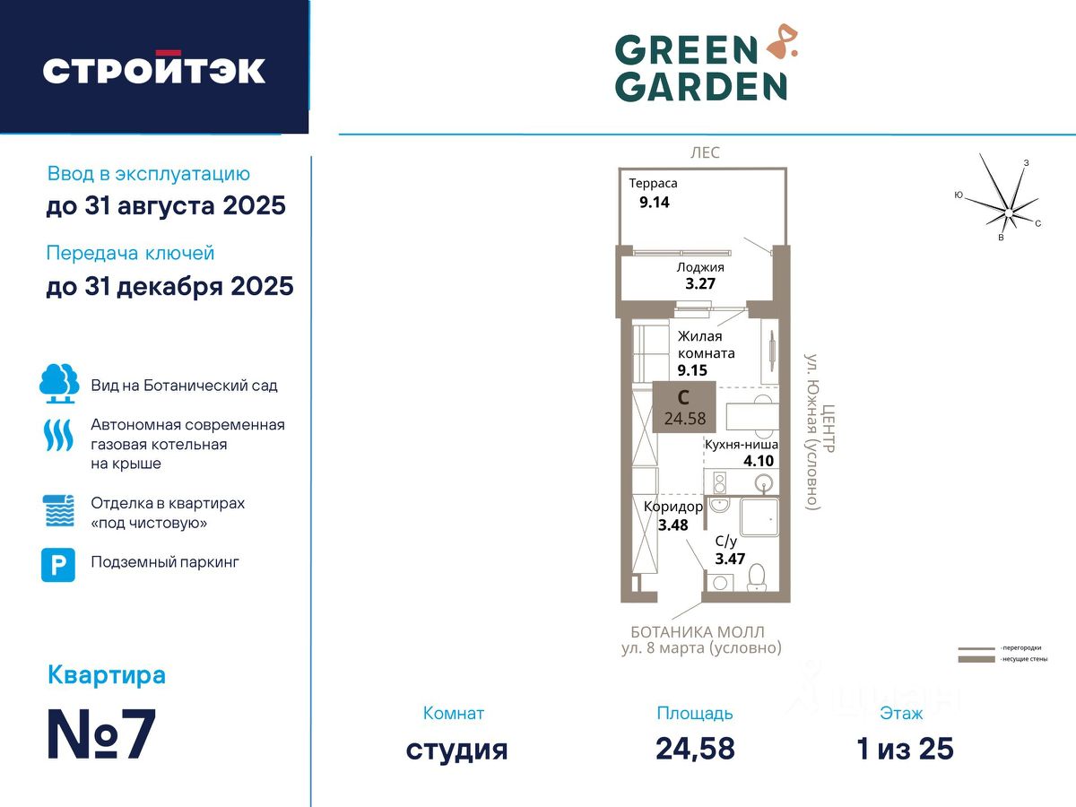 Жилой комплекс Green Garden (Грин Гарден) расположен в микрорайоне Ботанический, в сердце Ботанического сада — по адресу 8 марта, 204е. Дом сдан. Продажа квартир осуществляется по договору купли-продажи от застройщика. Район Экологичный Ботанический микрорайон — один из самых молодых, и при этом развитых в городе. 100-летний Ботанический сад — прямо у дома 5 минут пешком до остановки транспорта 8 минут пешком до ''Ботаники Молл'' 10 минут на машине до центра города 2 км через парк — до метро ''Ботаническая'' 6 школ и 7 детсада поблизости Двор Кроме привычных элементов окружения, у дома — современная автономная газовая котельная на крыше — независимая, экономичная и безопасная. Концепция ''Двор без машин'', когда можно заехать только для разгрузки и погрузки Закрытая и освещённая территория без посторонних Круглосуточное видеонаблюдение Собственный сад с деревьями и кустарниками Детские и спортивные площадки, места для отдыха и мероприятий Подземный паркинг на 114 мест Подъезды Богатое и утончённое оформление холлов, удобная мягкая мебель, информативная навигация, стойка ресепшн и радушный консьерж. И это — не всё. Доступ в подъезд на уровне земли — без барьеров Домофон в тёплом остеклённом тамбуре 4 лифта, 2 из которых — грузовые Помещения для колясок и самокатов на 1 этаже Комната гигиены, чтобы помыть руки или лапы Планировки Обратите внимание на варианты с тёплыми лоджиями панорамного остекления, а также с террасами на первом этаже. В остальном — наш золотой стандарт — подход ''Разумные метры''. Объединённые кухни-гостиные для простора и общения Отказ от бесполезных зон Отделка В Green Garden (Грин Гарден) мы предоставили вам свободу для творчества и выполнили отделку ''под чистовую''. На полу цементно-песчаная стяжка, на стенах — штукатурка, на потолках балконов — краска Усиленная сейф-дверь на входе в квартиру, на балконах и лоджиях — остекление В санузлах установлены унитазы, раковины и смесители, а во всей квартире — розетки и выключатели Радиаторы с терморегуляторами и горизонтальной разводкой Естественная вытяжка с механическим побуждением Двухкамерные стеклопакеты с приточными клапанами вентиляции Телеметрические счётчики на свет, тепло и воду
