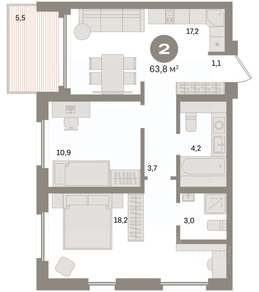 Квартира с кухней-гостиной и двумя спальнями в Южных кварталах. Особенности планировки: гардеробная, вид во двор, предчистовая отделка, мастер-спальня, балкон. квартиры в нашей базе: ЮК04-А1-9-9.18.10.