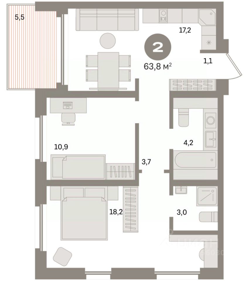 Квартира с кухней-гостиной и двумя спальнями в Южных кварталах. Особенности планировки: вид во двор, предчистовая отделка, мастер-спальня, балкон. квартиры в нашей базе: ЮК04-А1-9-9.13.11.