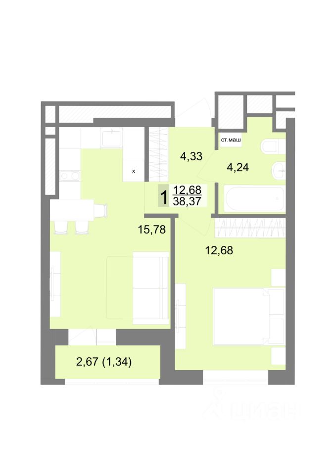 Общая площадь38,37 м2