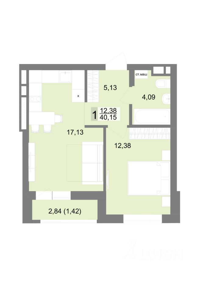 Общая площадь40,15 м2