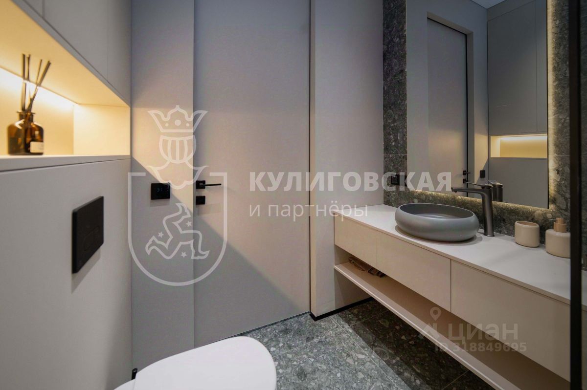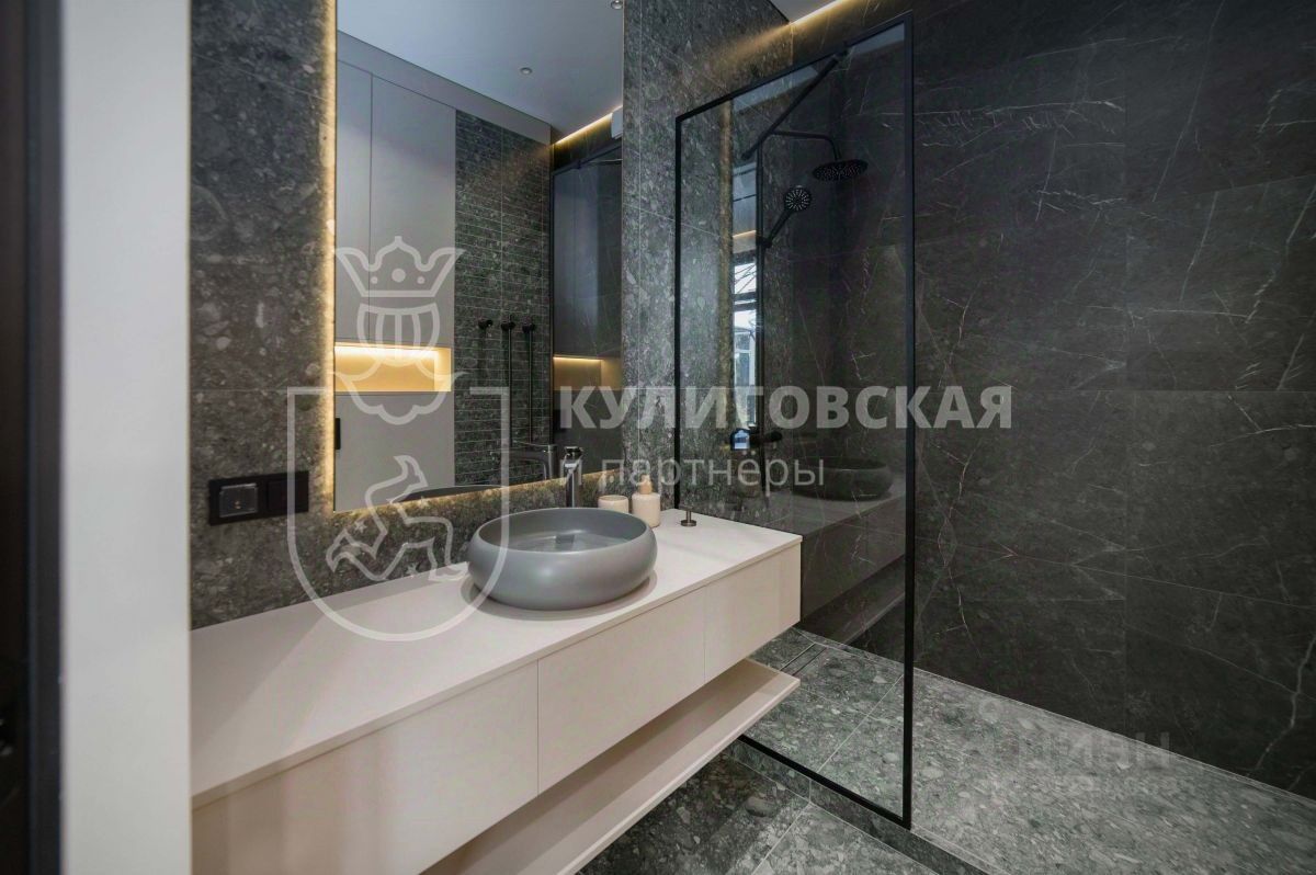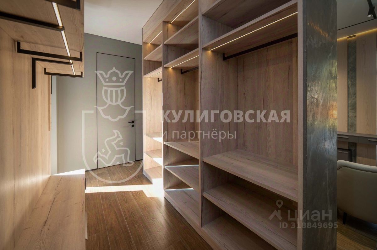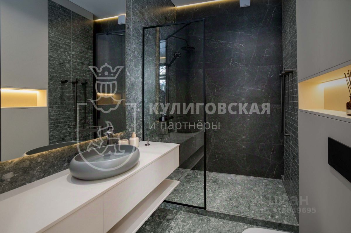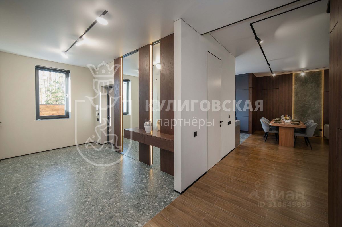 Среди материалов отделки использовались керамогранит под разные породы мрамора, кварцевый ламинат, стеклохолст/обои под покраску, шпонированные панели. Во всем интерьере присутствуют встроенная деревянная мебель, изготовленная по индивидуальному заказу.
