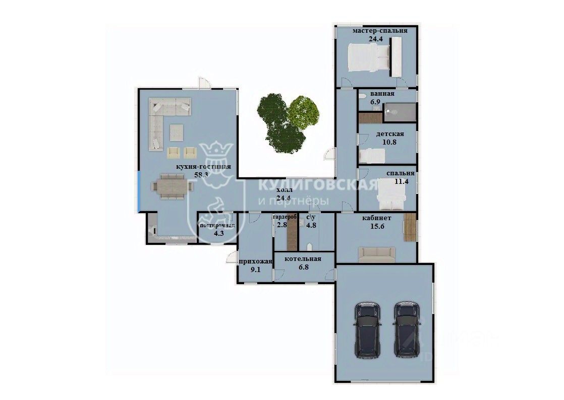 Отличная эргономичная планировка дома приятно восхитит Вас и порадует очень продуманными планировочными решениями: Дом разделен на 2 зоны: гостевую с кухней гостиной и приватную с 3 спальнями и кабинетом. В каждой зоне свой сан. узел. Также в доме грамотно организован хоз. блок с постирочной и гардеробной.