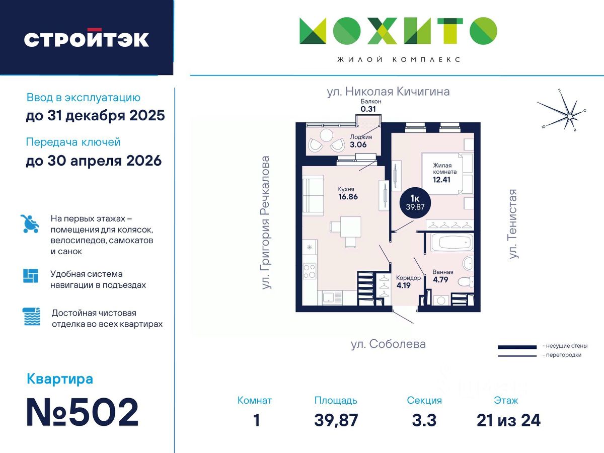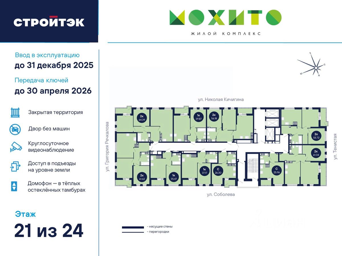 ЖК ''Мохито'' — это квартал комфорт-класса, уютно расположенный в границах улиц Тенистая Григория Речкалова Николая Кичигина. Первая очередь ЖК ''Мохито'' уже заселена, а вторая будет сдана в эксплуатацию до конца декабря 2025 года. Вторая очередь строительства дополняет и завершает облик ЖК. Дом состоит из двух секций в 24 этажа, которые объединяет между собой 8-этажный модуль. На первом этаже предусмотрены помещения для офисов. Академический район — один из самых молодых районов города Екатеринбурга. Прогрессивный подход к застройке, широкие улицы, транспортная доступность и богатая инфраструктура привлекает сюда новосёлов.