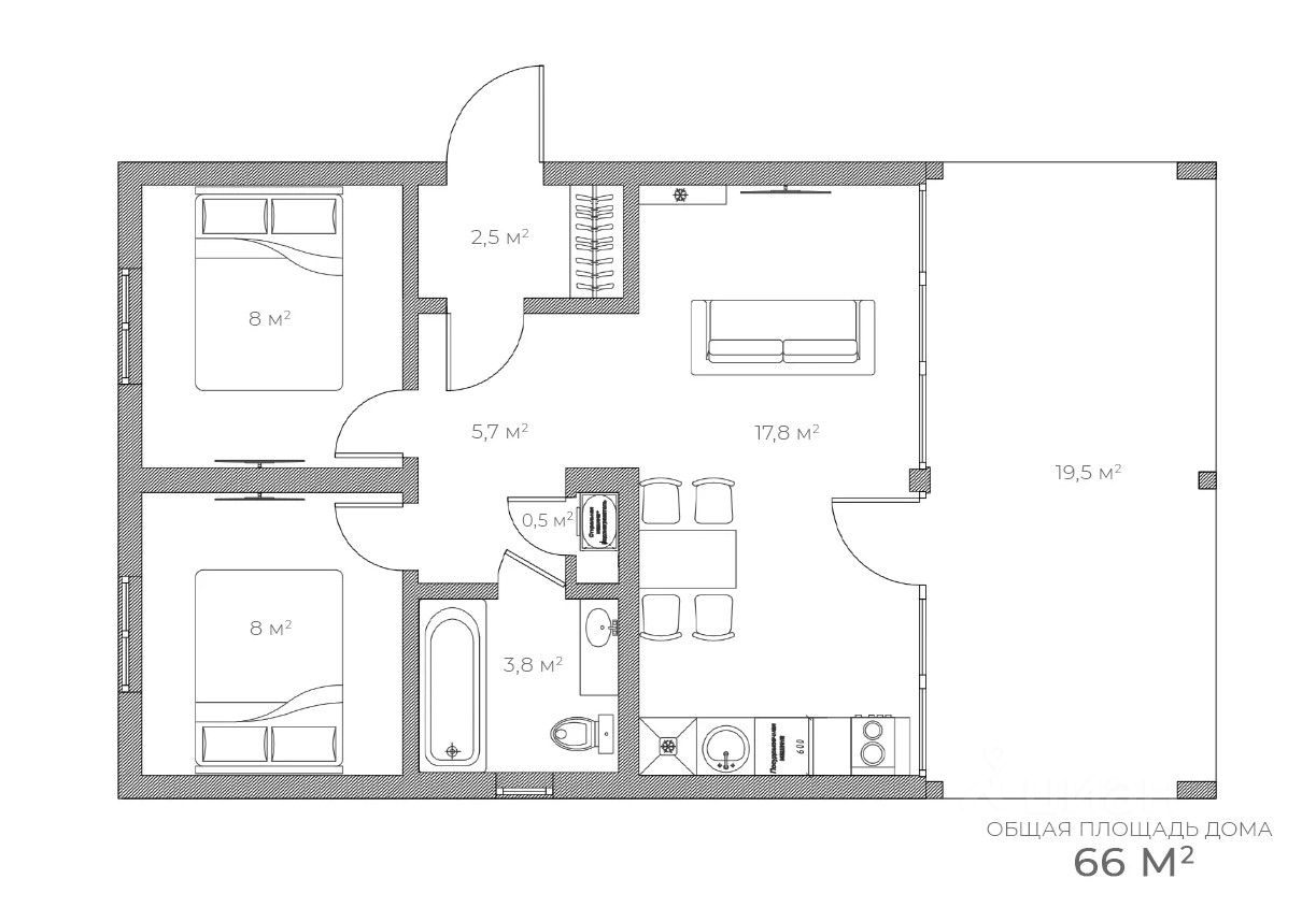 Габаритные размеры указаны по внешним ограждающим конструкциям, могут варьироваться в диапазоне +/- 50мм. Общая площадь помещений 65,8 м2.