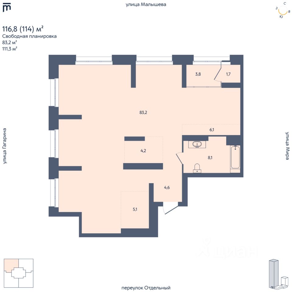 Рядом — улица Малышева и проспект Ленина, но в доме сохраняется тишина даже с открытыми окнами. Удобный выезд в любую часть города. В шаговой доступности — учебные заведения, магазины, скверы, медицинские и спортивные центры.