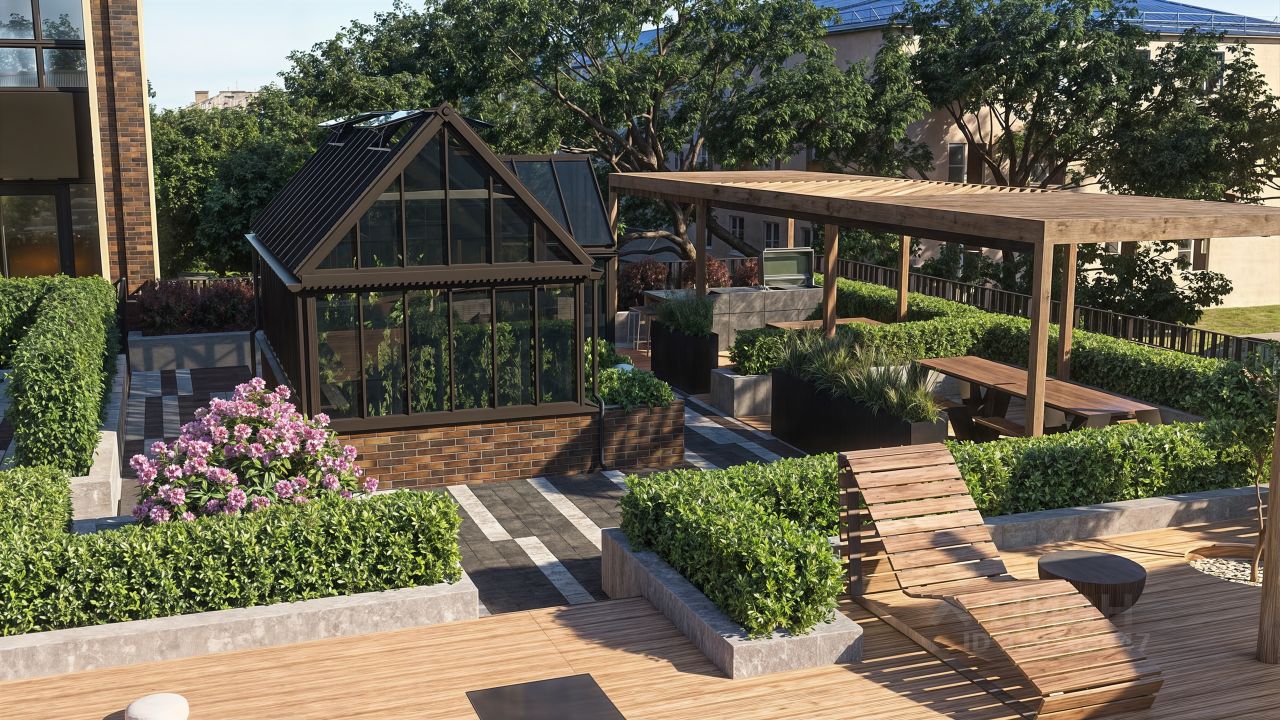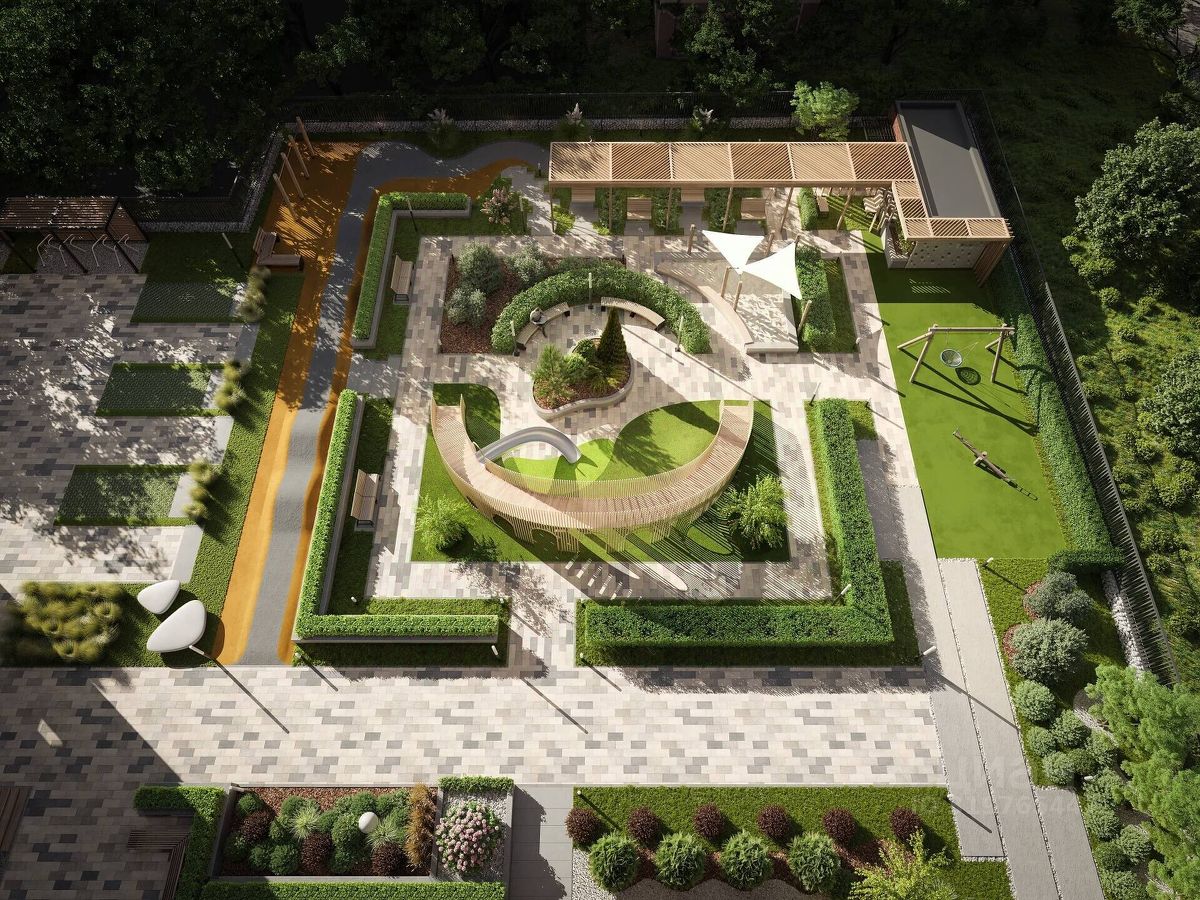 Два уровня дворового пространства: На первом уровне — игровые зоны для детей 312 лет: горки, качели, дорожки для самокатов, скалодром, песочница. На стилобате — теплица-оранжерея, зоны для пикников, места для отдыха и уединения, шезлонги и детская винтовая горка. Двор закрытый и безопасный, с контролем доступа для жителей.