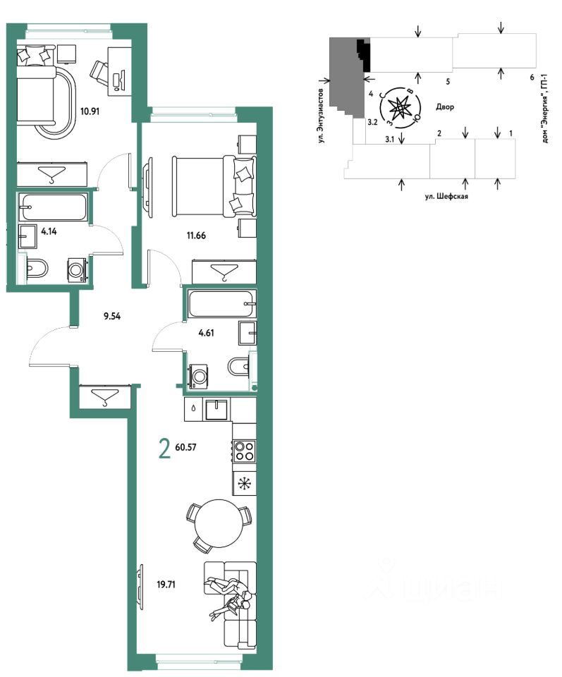 Продаётся 2-комнатная квартира в строящемся доме (Потенциал), срок сдачи: IV-кв. 2027, общей площадью 60.57 кв.м., на 14 этаже. Новый жилой комплекс ''Страна.Энтузиастов'' от группы компаний ''Страна Девелопмент'' расположен по адресу: г. Екатеринбург, по ул. Шефская.