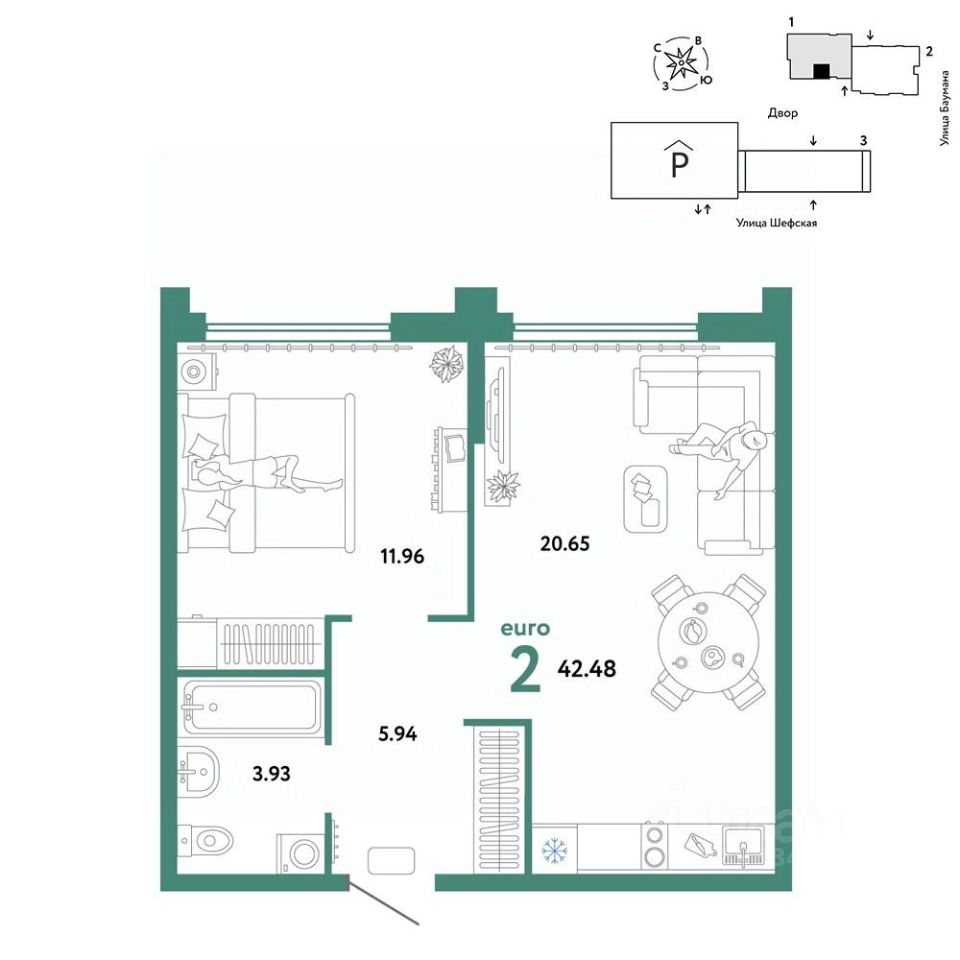 Продается 2комнатная квартира на 24 этаже от застройщика Страна Девелопмент. Площадь квартиры 42,48 кв. м. Стоимость указана без учета акций.