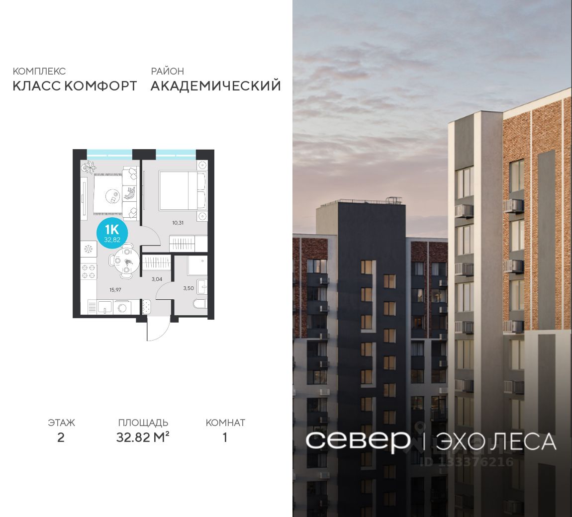 Продаётся квартира площадью 32.82 м2 в жилом комплексе ''Эхо леса''. Квартира находится на 2 этаже, жилая площадь квартиры 10.31 м2, площадь просторной кухни — 15.97 м2. Среди особенностей планировки — изолированные комнаты с окнами на одну сторону, 1 совмещённый санузел.