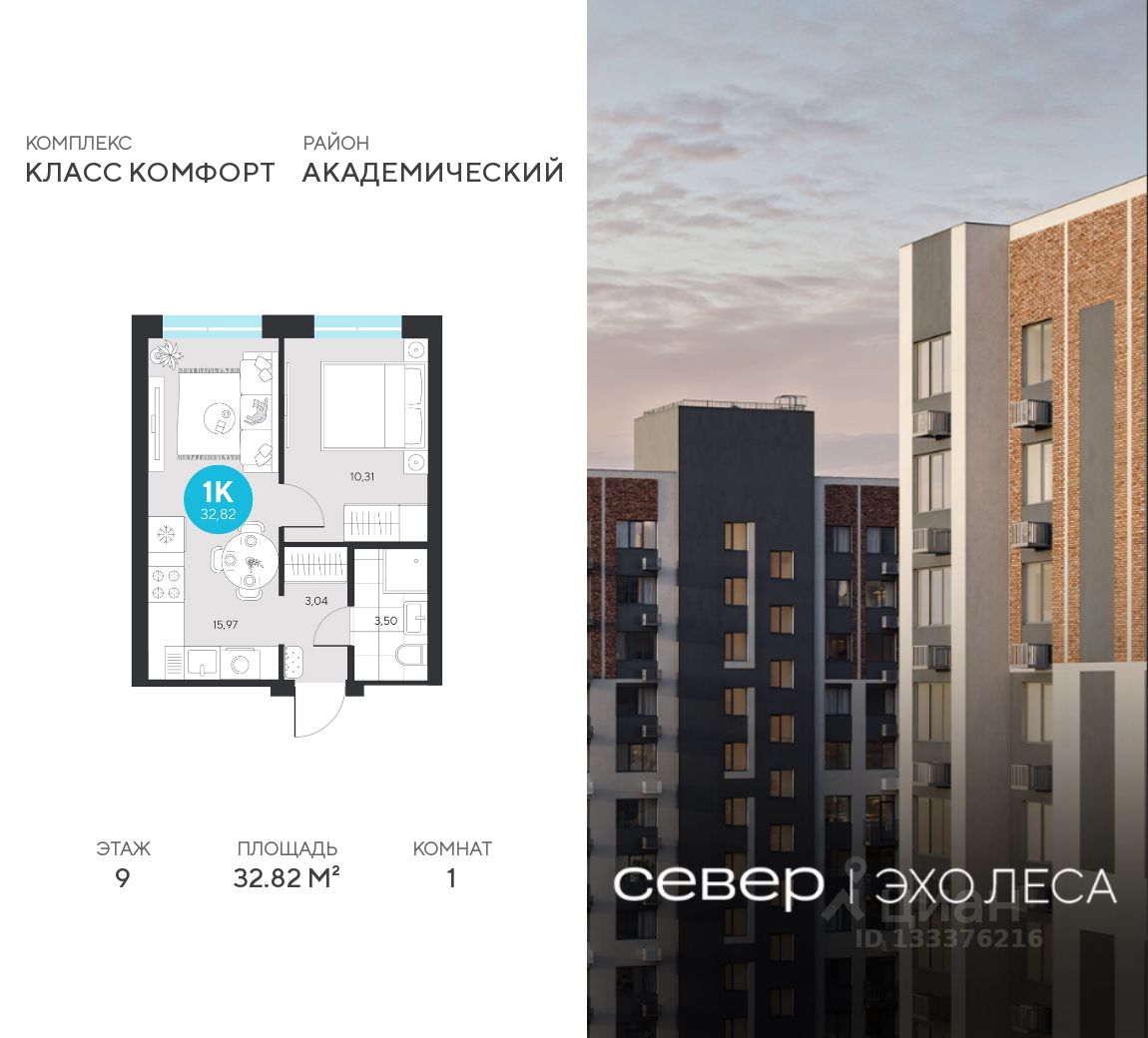 Продаётся квартира площадью 32.82 м2 в жилом комплексе ''Эхо леса''. Квартира находится на 9 этаже, жилая площадь квартиры 10.31 м2, площадь просторной кухни — 15.97 м2. Среди особенностей планировки — изолированные комнаты с окнами на одну сторону, 1 совмещённый санузел.