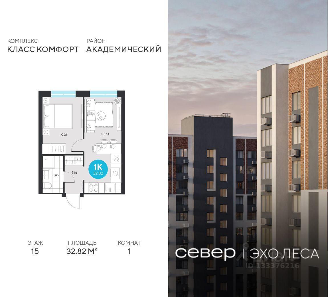 Продаётся квартира площадью 32.82 м2 в жилом комплексе ''Эхо леса''. Квартира находится на 15 этаже, жилая площадь квартиры 10.31 м2, площадь просторной кухни — 15.9 м2. Среди особенностей планировки — изолированные комнаты с окнами на одну сторону, 1 совмещённый санузел.