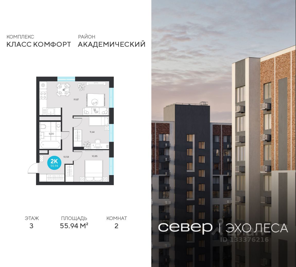 Продаётся квартира площадью 55.94 м2 в жилом комплексе ''Эхо леса''. Квартира находится на 3 этаже дома, который будет введен в эксплуатацию в 1 квартале 2028 года. Жилая площадь квартиры 20.49 м2, площадь просторной кухни — 19.87 м2. Среди особенностей планировки — изолированные комнаты с окнами на одну сторону, 1 совмещённый санузел.