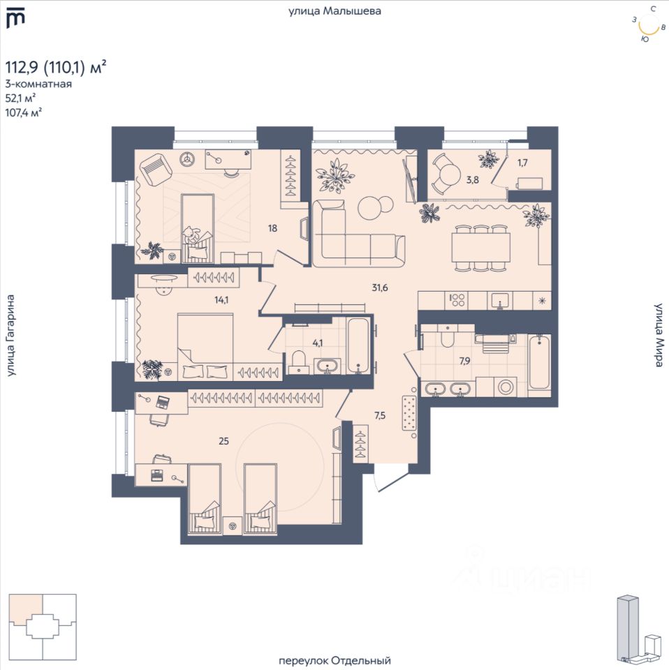 Продам 3-комнатную квартиру 110,1 кв. метра, высота потолков 3 метра, панорамный вид на центр Екатеринбурга. В квартире теплая лоджия, кухня-гостиная 31,6 кв. метра, мастер-спальня с санузлом.