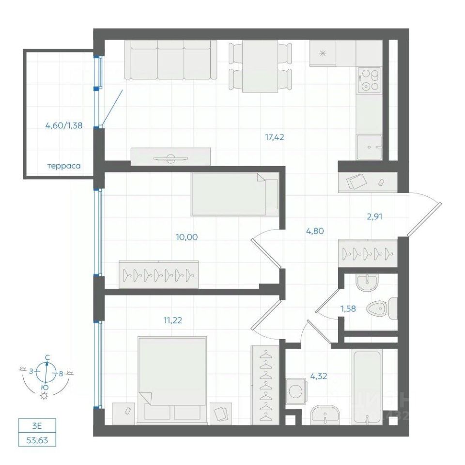 Общая площадь53,63 м2