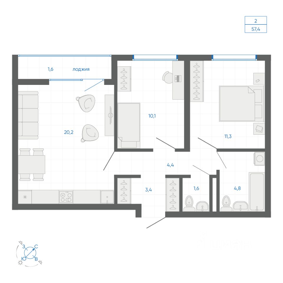 Общая площадь57,4 м2