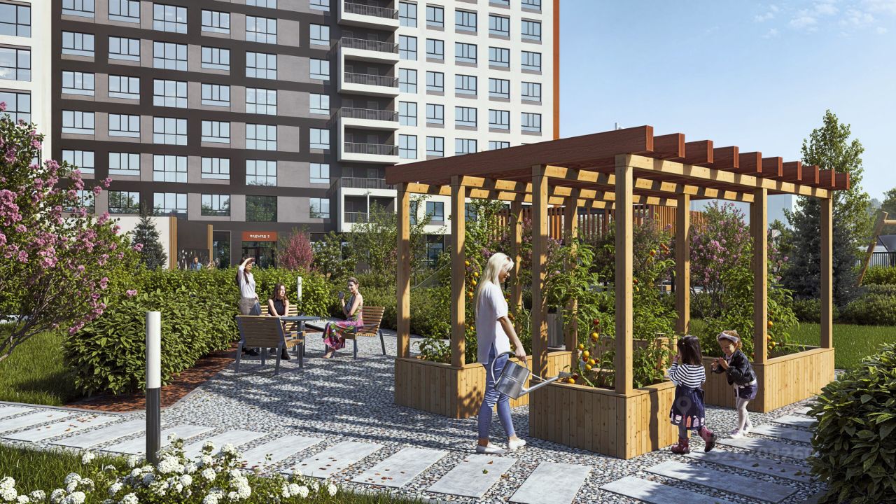 Комплекс располагается условно в центре нового фронта застройки улицы Викулова. Посадка домов сформирована параллельно улице, таким образом создавая закрытое приватное пространство от оживленной магистральной улицы. Архитектура и фасадные материалы откликаются на контекст, вносят в него новое, не доминируя. 7-ми этажная секция сдвигается вглубь участка, отделяясь от 25 - этажной секции. Это сомасштабный человеку объем с отделкой под клинкерный кирпич, с сочетанием разной кладки, что придает комплексу строгий и элегантный вид. Верхний этаж подрезается в местах лоджий, формируя силуэт. 25 - этажная секция - это наслоение двух объемов. Каждый фасад имеет свой ''взгляд'' на город. В торцах башни появляются лоджии-призмы, объединенные в 2-3-7 этажей смещены относительно друг друга. Этот прием помогает акцентировать торцы с дальних ракурсов, при этом основная фасадная сетка остается спокойной, постепенно растягиваясь к верхним этажам. Со 2 по 8 этажи на белой плоскости фасада появляются эркеры, создавая аккуратный рельеф.