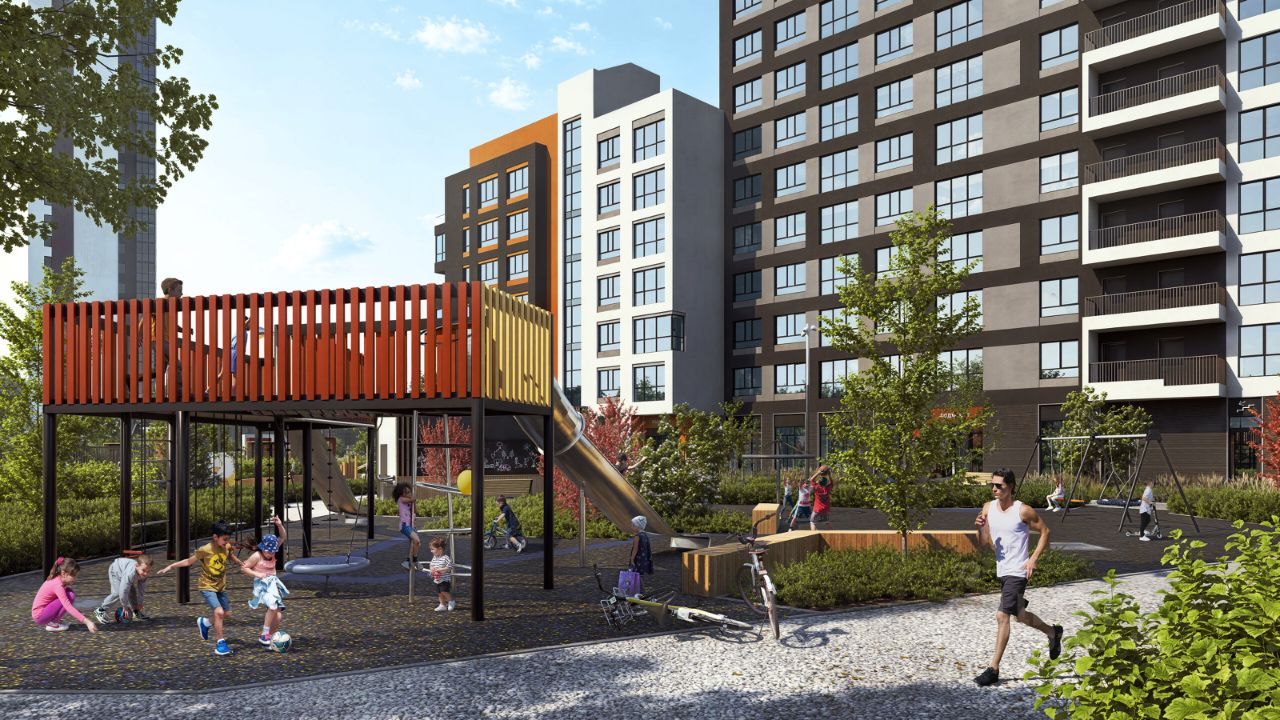 Комплекс располагается условно в центре нового фронта застройки улицы Викулова. Посадка домов сформирована параллельно улице, таким образом создавая закрытое приватное пространство от оживленной магистральной улицы. Архитектура и фасадные материалы откликаются на контекст, вносят в него новое, не доминируя. 7-ми этажная секция сдвигается вглубь участка, отделяясь от 25 - этажной секции. Это сомасштабный человеку объем с отделкой под клинкерный кирпич, с сочетанием разной кладки, что придает комплексу строгий и элегантный вид. Верхний этаж подрезается в местах лоджий, формируя силуэт. 25 - этажная секция - это наслоение двух объемов. Каждый фасад имеет свой ''взгляд'' на город. В торцах башни появляются лоджии-призмы, объединенные в 2-3-7 этажей смещены относительно друг друга.